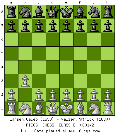 Last move : 1-0 2010 May 18 20:24:2 [Event "FICGS__CHESS__CLASS_C__000142"] [Site "FICGS"] [Date "2010.04.05"] [Round "1"] [White "Larsen,Caleb"] [Black "Valzer,Patrick"] [Result "1-0"] [WhiteElo "1638"] [BlackElo "1800"] 1.b3 1-0 This chess game has been lost on time (started : 2010.04.05 16:5:29) Nimzovich-Larsen attack Player White won this chess game. Follow this game move after move (download)Human affairs are like a Chess game: only those who do not take it seriously can be called good players. (Hung Tzu Ch'eng) Es hat in meinem Leben Zeiten gegeben, in denen das Schachspiel, wenn nicht zum Lebenszweck, so doch zu einem regelrechten Lebensersatz geworden ist. Man fühlt sich in solchen Zeiten nicht so, als besäße man eine göttliche Gabe, sondern eher so, als sei man von ihr besessen. (Garry Kasparov) Una compensación adecuada por un sacrificio es tener una combinación sólida que conduce a una posición ganadora; una compensación adecuada por una metida de pata es dejar a tu oponente arrebatar una derrota de las fauces de la victoria. (Bruce A. Moon) La tactique est l'élément le plus important du milieu de jeu. (Siegbert Tarrasch) Players are not good because they find tactics, it is about the way to find the positions in which those tactics are hidden. (Luc-Olivier Leclerc)