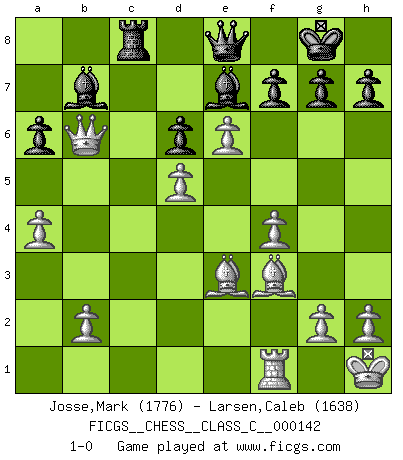 Last move : 1-0 2010 August 19 22:43:20 [Event "FICGS__CHESS__CLASS_C__000142"] [Site "FICGS"] [Date "2010.04.05"] [Round "1"] [White "Josse,Mark"] [Black "Larsen,Caleb"] [Result "1-0"] [WhiteElo "1776"] [BlackElo "1638"] 1.e4 c5 2.Nc3 e6 3.Nge2 Nc6 4.d4 cxd4 5.Nxd4 Qc7 6.Be2 a6 7.Be3 Nf6 8.O-O Be7 9.f4 d6 10.a4 O-O 11.Kh1 b6 12.Nxc6 Qxc6 13.Bf3 Bb7 14.e5 Nd5 15.Nxd5 exd5 16.c4 Qc7 17.cxd5 Rfc8 18.Qb3 Rab8 19.Rac1 Qd7 20.e6 Qe8 21.Rxc8 Rxc8 22.Qxb6 1-0 Sicilian : Closed Kingside Castling by player White (move 8) Kingside Castling by player Black (move 10) Player White won this chess game. Follow this game move after move (download)One doesn't have to play well, it's enough to play better than your opponent. (Siegbert Tarrasch) Dieses schreckliche Gefühl, dass ich gegen eine Maschine spielte, die niemals Fehler macht, zerschmetterte meinen Widerstand. (Mark Taimanov) El jugador blanco perdió porque fallo en recordar la coreccta continuación y tuvo que pensar por sí mismo las movidas. (Siegbert Tarrasch) Celui qui prend des risques peut perdre, celui qui n'en prend pas perd toujours. (Xavier Tartacover) Sometimes it pays to stay in bed in Monday, rather than spending the rest of the week debugging Monday's code. (Dan Salomon)