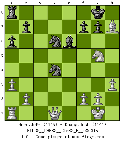 Last move : 1-0 2007 January 22 18:54:16 [Event "FICGS__CHESS__CLASS_F__000015"] [Site "FICGS"] [Date "2006.10.27"] [Round "1"] [White "Herr,Jeff"] [Black "Carlo,John"] [Result "1-0"] [WhiteElo "1149"] [BlackElo "1141"] 1.d4 d5 2.c4 e6 3.Nf3 Nf6 4.Bg5 Be7 5.e3 O-O 6.Be2 Nc6 7.O-O Ne8 8.Bxe7 Qxe7 9.Nc3 Nf6 10.a3 e5 11.cxd5 exd4 12.exd4 Nb8 13.Re1 c6 14.Bc4 Qd6 15.dxc6 Nxc6 16.h3 Re8 17.Rxe8+ Nxe8 18.Nb5 a6 19.Nxd6 Nxd6 20.Bd3 Be6 21.Ng5 Nxd4 22.Bxh7+ 1-0 QGD Kingside Castling by player Black (move 5) Kingside Castling by player White (move 7) Player White won this chess game. Follow this game move after move (download)Some sacrifices are sound; the rest are mine. (Mikhail Tal) Man gibt nur Pakete auf. (Paul Keres) Durante una competencia de Ajedrez, un Maestro de Ajedrez deberá ser una combinación de presa de caza y un Monge. (Alexander Alekhine) Mon pion favori sur ma case favorite ! Bronstein en parlant d'un coup de pion en h5 quand il avait les Noirs. When I took office, only high energy physicists had ever heard of what is called the World Wide Web... Now even my cat has its own page. (Bill Clinton, 1996)