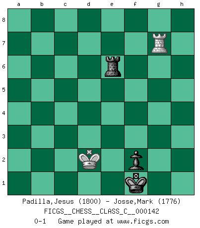 Last move : 0-1 2010 September 14 16:29:1 [Event "FICGS__CHESS__CLASS_C__000142"] [Site "FICGS"] [Date "2010.04.05"] [Round "1"] [White "Padilla,Jesus"] [Black "Josse,Mark"] [Result "0-1"] [WhiteElo "1800"] [BlackElo "1776"] 1.e4 c5 2.Nf3 d6 3.d4 cxd4 4.Nxd4 Nf6 5.Nc3 a6 6.Be2 e5 7.Nb3 Be7 8.O-O O-O 9.a4 Be6 10.Bf3 Qc7 11.Re1 Rc8 12.Be3 Nbd7 13.a5 h6 14.h3 Nf8 15.h4 N8d7 16.Qe2 Qc6 17.Red1 Bc4 18.Qd2 Qc7 19.Ra4 b5 20.axb6 Nxb6 21.R4a1 Be6 22.Na5 Nc4 23.Nxc4 Bxc4 24.Rdb1 a5 25.Na4 Rab8 26.b3 Be6 27.c4 Nd7 28.Nc3 Nc5 29.Nb5 Qd8 30.Rxa5 Bxh4 31.R5a1 Bg5 32.Bxg5 Qxg5 33.Qxg5 hxg5 34.Nxd6 Rc6 35.Nb5 g4 36.Be2 Nxe4 37.Re1 Nd6 38.Nxd6 Rxd6 39.Rad1 Rd4 40.Rxd4 exd4 41.Bd1 Bf5 42.Re5 g6 43.Rd5 d3 44.Kh2 Kg7 45.Rd6 Kh6 46.Kg3 Kg5 47.f4+ gxf3 48.gxf3 Kh6 49.f4 Kg7 50.Rd4 Kf8 51.c5 Ke7 52.b4 f6 53.Ba4 Rc8 54.c6 Rd8 55.Rc4 d2 56.Bd1 Rd3+ 57.Kf2 Kd8 58.b5 Kc7 59.Rc2 Be6 60.Ke2 Rd5 61.Ke3 Rxb5 62.Rxd2 Bd5 63.Ba4 Rc5 64.Rh2 Bxc6 65.Bxc6 Rxc6 66.Rh6 f5 67.Rh7+ Kd6 68.Rg7 Kd5 69.Kd3 Re6 70.Rg8 Ra6 71.Rd8+ Ke6 72.Rg8 Kf7 73.Rb8 Re6 74.Rb7+ Kf6 75.Rb4 g5 76.fxg5+ Kxg5 77.Kd2 f4 78.Rb5+ Kg4 79.Rb8 Kg3 80.Rg8+ Kf2 81.Kd1 f3 82.Rg7 Kf1 83.Kd2 f2 0-1 Sicilian : Najdorf, Opovcensky variation Kingside Castling by player White (move 8) Kingside Castling by player Black (move 8) 10 pieces endgame at move 62 : White KRBPP , Black KRBPP WHITE : King + 1 Rook 1 Bishop 2 Pawns BLACK : King + 1 Rook 1 Bishop 2 Pawns 9 pieces endgame at move 64 : White KRBP , Black KRBPP WHITE : King + 1 Rook 1 Bishop 1 Pawn BLACK : King + 1 Rook 1 Bishop 2 Pawns 8 pieces endgame at move 65 : White KRBP , Black KRPP WHITE : King + 1 Rook 1 Bishop 1 Pawn BLACK : King + 1 Rook 2 Pawns 7 pieces endgame at move 65 : White KRP , Black KRPP WHITE : King + 1 Rook 1 Pawn BLACK : King + 1 Rook 2 Pawns 6 pieces endgame at move 76 : White KRP , Black KRP WHITE : King + 1 Rook 1 Pawn BLACK : King + 1 Rook 1 Pawn 5 pieces endgame at move 76 : White KR , Black KRP WHITE : King + 1 Rook BLACK : King + 1 Rook 1 Pawn Player Black won this chess game. Follow this game move after move (download)In Chess, as it is played by masters, chance is practically eliminated. (Emanuel Lasker) Ich war zu klein für die Schach-Schülermannschaft! (Woody Allen) Debemos de asegurarnos de que el Ajedrez no se convierta en un lenguaje muerto, muy interesante, pero solo para un grupo muy pequeño. (Sytze Faber) Votre prénom est 'Tactique', votre deuxième prénom est 'Tactique' et votre nom est 'Tactique'. (Ken Smith) Men should grow up. - Yeah. And dogs should stop licking themselves. It's not gonna happen. (Gregory House to Dr. Cameron, House M.D.)