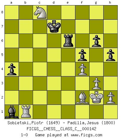 Last move : 1-0 2010 July 10 17:34:50 [Event "FICGS__CHESS__CLASS_C__000142"] [Site "FICGS"] [Date "2010.04.05"] [Round "1"] [White "Sobietski,Piotr"] [Black "Padilla,Jesus"] [Result "1-0"] [WhiteElo "1649"] [BlackElo "1800"] 1.e4 c5 2.Nf3 d6 3.d3 Nc6 4.g3 Nf6 5.Bg2 g6 6.c3 Bg7 7.O-O O-O 8.Na3 Be6 9.Qe2 h6 10.Bd2 Qb6 11.Nc4 Bxc4 12.dxc4 Qxb2 13.Rfc1 Qa3 14.Rcb1 Qa6 15.Ne1 Na5 16.Bf1 e6 17.f3 Rad8 18.Nc2 d5 19.cxd5 Qxe2 20.Bxe2 exd5 21.e5 Nd7 22.f4 Nb6 23.Ne3 Rfe8 24.Re1 Nc6 25.Rab1 Re7 26.Kf2 h5 27.Ng2 Red7 28.Bb5 Rc7 29.Red1 f6 30.e6 Ne7 31.a4 f5 32.Ne3 d4 33.cxd4 cxd4 34.Ng2 Rd6 35.Rbc1 Rxc1 36.Rxc1 Nbd5 37.Bd7 Rb6 38.Ne1 Rb3 39.Rc4 d3 40.Nf3 Nf6 41.Rc1 Ne4+ 42.Kf1 a6 43.a5 Kf8 44.Rd1 Bf6 45.Be1 Nd5 46.Kg1 Ke7 47.Kh1 Nc5 48.Bf2 Nxd7 49.exd7 Kxd7 50.Ne1 Rb5 51.Nxd3 Rxa5 52.Kg2 Rb5 53.Re1 a5 54.Nc5+ Kd8 55.Rd1 Kc7 56.Rxd5 Kc6 57.Rd7 b6 58.Rf7 Bb2 59.Na4 Ba1 60.Re7 Rb4 61.Nxb6 Re4 62.Rd7 a4 63.Ra7 Kb5 64.Nc8 Re6 65.Rb7+ Kc6 66.Rb6+ Kd7 67.Rb1 1-0 Sicilian Kingside Castling by player White (move 7) Kingside Castling by player Black (move 7) Player White won this chess game. Follow this game move after move (download)Pawn endings are to Chess what putting is to golf. (Cecil Purdy) Fischer: 'Remis!?' Uhlmann: 'Aber es muss doch dreimal Zugwiederholung sein!' Fischer: 'Sie nehmen das Remis an, wie ich es sage, sonst spiele ich weiter und werde Sie dann schlagen!' (Robert James Fischer) Aunque la mayoría de la gente disfruta observar las partidas de los grandes Maestros de ataque, algunos de los jugadores mas notables en la historia han sido los jugadores silenciosos posicionales. Lentamente ellos te aplastan despojandote de tu espacio, congestionando tus piezas y dejandote virtualmente sin nada que hacer. (Yasser Seirawan) Mais l'homme est une créature légère et illogique : semblable au joueur d'échecs, il n'aime que le processus du but à atteindre, non le but lui-même. (Dostoïevsky) Any activity becomes creative when the doer cares about doing it right or doing it better. (John Updike)