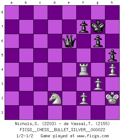 Last move : 1/2-1/2 2010 April 5 22:55:35 [Event "FICGS__CHESS__BULLET_SILVER__000022"] [Site "FICGS"] [Date "2010.04.05"] [Round "1"] [White "Nichols,Scott"] [Black "de Vassal,Thibault"] [Result "1/2-1/2"] [WhiteElo "2203"] [BlackElo "2155"] 1.e4 c5 2.d4 cxd4 3.c3 dxc3 4.Nxc3 Nc6 5.Nf3 e6 6.Bc4 a6 7.O-O d6 8.Qe2 b5 9.Bb3 Nge7 10.Be3 Na5 11.Bc2 Nec6 12.b3 Be7 13.Rac1 Bd7 14.Rfd1 O-O 15.Qd2 Rc8 16.Ne2 Nb7 17.b4 a5 18.a3 axb4 19.axb4 d5 20.exd5 Nxb4 21.dxe6 Bxe6 22.Be4 Rxc1 23.Qxc1 Qc8 24.Bd2 Bc4 25.Ned4 Nd3 26.Qb1 Nbc5 27.Bc6 Qc7 28.Bxb5 Rb8 29.Be3 Bf6 30.Bxc4 Rxb1 31.Rxb1 g6 32.g3 Kg7 33.h4 h5 34.Rb5 Be7 35.Rb1 Qd7 36.Bb5 Qd5 37.Rd1 Nb4 38.Rb1 Nd7 39.Ra1 Ne5 40.Nxe5 Qxe5 41.Re1 Kg8 42.Bc4 Bd6 43.Rd1 Qe4 44.Nf3 Be7 45.Nd2 Qf5 46.Ra1 Nc6 47.Rc1 Ne5 48.Be2 Ng4 49.Bd4 Bf8 50.Bxg4 Qxg4 51.Be3 Qe6 52.Rc4 Kh7 53.Kh2 Bh6 54.Bxh6 Kxh6 55.Rf4 Kg7 1/2-1/2 Sicilian : Smith-Morra gambit Kingside Castling by player White (move 7) Kingside Castling by player Black (move 14) This chess game ended in a draw. Follow this game move after move (download)Chess makes man wiser and clear-sighted. (Vladimir Putin) Rauchen ist dem Schachspieler bei seiner Arbeit, also im Wettkampf, untersagt. (Viktor Kortschnoi) El Ajedrez es imaginación. (David Bronstein) La victoire dans une partie d'Echecs appartient la plupart du temps à celui qui voit un peu plus loin que l'adversaire. (Lasker) Now be brave and don't look back. Don't look back. (Shmi Skywalker in Star Wars ep.1)