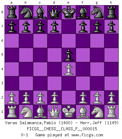 Last move : 0-1 2006 December 6 23:13:54 [Event "FICGS__CHESS__CLASS_F__000015"] [Site "FICGS"] [Date "2006.10.27"] [Round "1"] [White "Varas Salamanca,Pablo"] [Black "Herr,Jeff"] [Result "0-1"] [WhiteElo "1400"] [BlackElo "1149"] 1.e4 e5 0-1 This chess game has been lost on time (started : 2006.10.27 15:55:49) King's pawn game Player Black won this chess game. Follow this game move after move (download)The King is a fighting piece. Use it ! (Wilhelm Steinitz) Es hat in meinem Leben Zeiten gegeben, in denen das Schachspiel, wenn nicht zum Lebenszweck, so doch zu einem regelrechten Lebensersatz geworden ist. Man fühlt sich in solchen Zeiten nicht so, als besäße man eine göttliche Gabe, sondern eher so, als sei man von ihr besessen. (Garry Kasparov) Las piezas de Ajedrez son los bloques del alfabeto que moldean los pensamientos; y esos pensamientos, aunque hagan un diseño visual en el tablero, expresan abstractamente su belleza como un poema. (Marcel Duchamp) Dieu déplace le joueur, et celui-ci la pièce. Quel Dieu derrière Dieu commence donc la trame ? Arturo Perez-Reverte (prix de littérature policière 1993). Over-the-board chess is the favorite of mortals, correspondence chess is the favorite of the gods. (Eduard Dyckhoff)