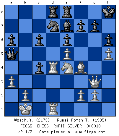 Last move : 1/2-1/2 2010 September 20 23:53:30 [Event "FICGS__CHESS__RAPID_SILVER__000018"] [Site "FICGS"] [Date "2010.04.09"] [Round "1"] [White "Wosch,Arkadiusz"] [Black "Russi Roman,Tano-Urayoan"] [Result "1/2-1/2"] [WhiteElo "2173"] [BlackElo "1995"] 1.e4 c6 2.d4 d5 3.Nc3 dxe4 4.Nxe4 Bf5 5.Ng3 Bg6 6.h4 h6 7.Nf3 Nd7 8.h5 Bh7 9.Bd3 Bxd3 10.Qxd3 e6 11.Bf4 Qa5+ 12.Bd2 Bb4 13.c3 Be7 14.c4 Qc7 15.O-O-O Ngf6 16.Kb1 O-O 17.Qe2 Rfe8 18.Ne5 Rad8 19.Bf4 b5 20.Qf3 Nxe5 21.dxe5 Nd7 22.Ne4 bxc4 23.Rd4 Qa5 24.Qg3 Kh8 25.Rhd1 a6 26.a3 1/2-1/2 Caro-Kann : Classical, 7...Nd7 Queenside Castling by player White (move 15) Kingside Castling by player Black (move 16) This chess game ended in a draw. Follow this game move after move (download)All Chess players should have a hobby. (Savielly Tartakower) Gegen einen Schachcomputer zu verlieren ist wie Löcher in den Strümpfen zuhaben. Es ist nicht peinlich, solange man der einzige ist der es weiß. (Anonymous) Diferente gente reacciona diferentemente en aceptar la derrota. (Bobby Fischer) La conception d'un plan est le processus par lequel un joueur exploite les avantages de sa position tout en s'efforçant d'en réduire au minimum les inconvénients. Afin de garantir le succès, un plan doit toujours se fonder sur un diagnostic objectif des particularités d'une position. La conception d'un plan est d'autant plus difficile que la position est équilibrée, et grandement facilitée lorsqu'il n'existe qu'un seul plan susceptible de répondre aux exigences de la position. (Harry Golombek) Methinks King Thibault should dub Marius Zubac a knight of the square board... I mean table, henceforth addressing him as Sir Marius, and bestow on him a suitable land from the kingdom of FICGS & marry him off to a worthy, fair maiden, lest he slice our heads with his mighty sword in his wrath. (Dinesh De Silva)