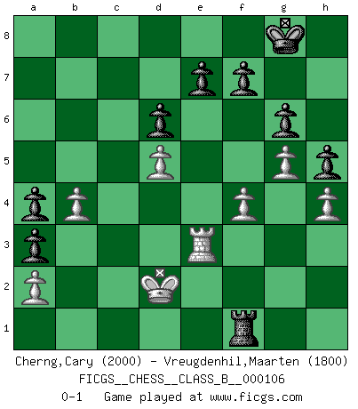 Last move : 0-1 2010 June 19 8:57:28 [Event "FICGS__CHESS__CLASS_B__000106"] [Site "FICGS"] [Date "2010.04.07"] [Round "1"] [White "Cherng,Cary"] [Black "Vreugdenhil,Maarten"] [Result "0-1"] [WhiteElo "2000"] [BlackElo "1800"] 1.e4 c5 2.Nf3 d6 3.d4 cxd4 4.Nxd4 Nf6 5.Nc3 g6 6.Be3 Bg7 7.f3 a6 8.Qd2 O-O 9.O-O-O Nc6 10.g4 Nxd4 11.Bxd4 Be6 12.h4 h5 13.Be2 Qa5 14.Qg5 b6 15.Qxa5 bxa5 16.Nd5 Bxd5 17.exd5 Rfb8 18.Rhe1 Rb7 19.c3 a4 20.g5 Nd7 21.f4 Bxd4 22.Rxd4 Rab8 23.Rd2 Nc5 24.Bc4 Rc7 25.Re3 a5 26.Bf1 a3 27.b3 a4 28.b4 Rxb4 29.cxb4 Nb3+ 30.Kd1 Rc1+ 31.Ke2 Nxd2 32.Kxd2 Rxf1 0-1 Sicilian : Dragon, Yugoslav attack Kingside Castling by player Black (move 8) Queenside Castling by player White (move 9) Player Black won this chess game. Follow this game move after move (download)Chess mastery essentially consists of analyzing Chess positions accurately. (Mikhail Botvinnik) Ich war zu klein für die Schach-Schülermannschaft! (Woody Allen) El Ajedrez es el juego mas altamente simbólico, pero las agresiones estan por lo tanto aún mas francamente representadas en la partida. Tal vez comenzo como un juego de guerra; Algo como la representación de una batalla en miniatura entre las fuerzas de dos reinos. (Karl Meninger) La guerre est enfant de la passion, la passion est enfant du narcissisme et le narcissisme est l'enfant. (...) Une autre partie ? (Thibault de Vassal) The next best thing to gambling and winning is gambling and loosing. (Nick Dandalos)