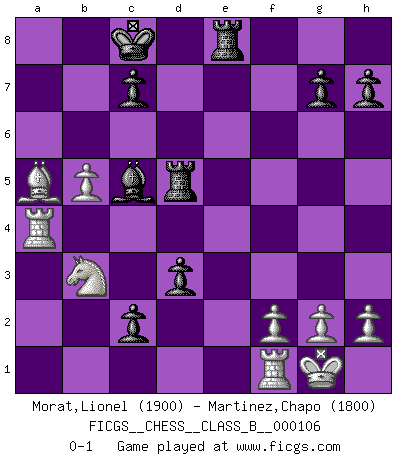 Last move : 0-1 2010 August 24 22:46:38 [Event "FICGS__CHESS__CLASS_B__000106"] [Site "FICGS"] [Date "2010.04.07"] [Round "1"] [White "Morat,Lionel"] [Black "Martinez,Chapo"] [Result "0-1"] [WhiteElo "1900"] [BlackElo "1800"] 1.e4 e5 2.Nf3 Nc6 3.Bb5 a6 4.Ba4 Nf6 5.O-O Nxe4 6.d4 b5 7.Bb3 d5 8.dxe5 Be6 9.Nbd2 Nc5 10.c3 d4 11.Ng5 Qxg5 12.Qf3 O-O-O 13.Bxe6+ fxe6 14.Qxc6 Qxe5 15.b4 Qd5 16.Qxd5 exd5 17.bxc5 dxc3 18.Nb3 d4 19.Ba3 c2 20.Bb4 Rd5 21.a4 a5 22.Bxa5 Bxc5 23.axb5 Re8 24.Ra4 d3 0-1 This chess game has been lost on time (started : 2010.04.07 4:45:50) Ruy Lopez : Open, 7.Bb3 Kingside Castling by player White (move 5) Queenside Castling by player Black (move 12) Player Black won this chess game. Follow this game move after move (download)There is no remorse like the remorse of Chess. (H. G. Wells) Das Blackmar-Diemer-Gambit verändert den ganzen Menschen! (Emil Joseph Diemer) Cualquier cambio de material en una posición debe venir por medio de un mate, una captura o promoción de Peón. (Purdy) À la honte des hommes, on sait que les lois du jeu sont les seules qui soient partout justes, claires, inviolables et exécutées. Pourquoi l'Indien qui a donné les règles du jeu d'échecs est-il obéi de bon gré dans toute la terre, et que les décrétales des papes, par exemple, sont aujourd'hui un objet d'horreur et de mépris ? C'est que l'inventeur des échecs combina tout avec justesse pour la satisfaction des joueurs, et que les papes, dans leurs décrétales, n'eurent en vue que leur seul avantage. L'Indien voulut exercer également l'esprit des hommes et leur donner du plaisir; les papes ont voulu abrutir l'esprit des hommes. Voltaire (Dictionnaire philosophique / Garnier 1967) God is an atheist. (Unknown)