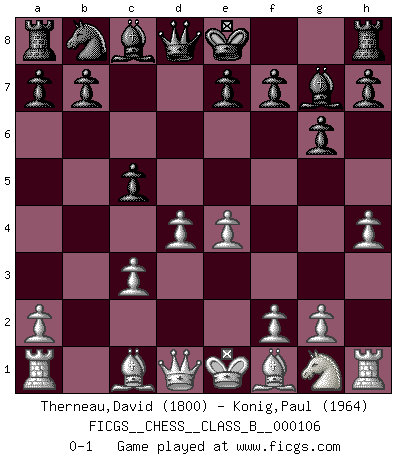 Last move : 0-1 2010 June 4 8:58:32 [Event "FICGS__CHESS__CLASS_B__000106"] [Site "FICGS"] [Date "2010.04.07"] [Round "1"] [White "Therneau,David"] [Black "Konig,Paul"] [Result "0-1"] [WhiteElo "1800"] [BlackElo "1964"] 1.c4 Nf6 2.d4 g6 3.Nc3 d5 4.cxd5 Nxd5 5.e4 Nxc3 6.bxc3 Bg7 7.h4 c5 0-1 This chess game has been lost on time (started : 2010.04.07 4:45:50) English, 1...Nf6 (Anglo-Indian defense) Player Black won this chess game. Follow this game move after move (download)There's never before been a Chess player with such a thorough knowledge of the intricacies of the game and such an absolutely indomitable will to win. I think Bobby is the greatest player that ever lived. (Lisa Lane) Im Fernschach kannst du während dem Spiel rauchen. (John Christen Knudsen) Aquel que teme a un Peón de Reina aislado, debería de retirarse del Ajedrez. (Siegbert Tarrasch) Des combinaisons [dans le jeu d'échecs] pareilles à des mélodies. Je crois entendre pour ainsi dire la musique des coups... (Vladimir Nabokov) The faster the computer, the slower the brain. (Thibault de Vassal)