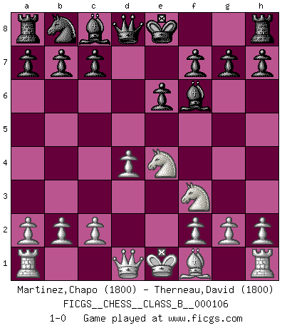 Last move : 1-0 2010 April 9 23:33:37 [Event "FICGS__CHESS__CLASS_B__000106"] [Site "FICGS"] [Date "2010.04.07"] [Round "1"] [White "Martinez,Chapo"] [Black "Therneau,David"] [Result "1-0"] [WhiteElo "1800"] [BlackElo "1800"] 1.e4 e6 2.d4 d5 3.Nc3 dxe4 4.Nxe4 Nf6 5.Bg5 Be7 6.Bxf6 Bxf6 7.Nf3 1-0 French : Rubinstein variation Player White won this chess game. Follow this game move after move (download)Robert Fischer is a law unto himself. (Larry Evans) Glücklicherweise sind Großmeister Ruben Fines reine Schachbücher weniger phallozentrisch [als seine Schachpsychologie] und deswegen auch weniger lächerlich. (Nigel Short) Si yo gano un torneo, yo lo gano por mí mismo. Yo hago las jugadas. Nadie me ayuda. (Bobby Fischer) Karpov est une pièce de musée. (Garry Kasparov) Logic : The art of thinking and reasoning in strict accordance with the limitations and incapacities of the human misunderstanding. (Ambrose Bierce)