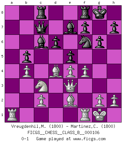 Last move : 0-1 2010 June 26 21:6:36 [Event "FICGS__CHESS__CLASS_B__000106"] [Site "FICGS"] [Date "2010.04.07"] [Round "1"] [White "Vreugdenhil,Maarten"] [Black "Martinez,Chapo"] [Result "0-1"] [WhiteElo "1800"] [BlackElo "1800"] 1.e4 c5 2.Nf3 d6 3.d4 cxd4 4.Nxd4 Nf6 5.Nc3 a6 6.Be2 e6 7.f4 Be7 8.Be3 Qc7 9.O-O Nc6 10.Qe1 Bd7 11.Rd1 Rc8 12.Qg3 Nxd4 13.Bxd4 O-O 14.a4 Bc6 15.b4 g6 16.Qe3 b5 17.axb5 axb5 18.Ra1 e5 0-1 Sicilian : Najdorf, Opovcensky variation Kingside Castling by player White (move 9) Kingside Castling by player Black (move 13) Player Black won this chess game. Follow this game move after move (download)Chess holds its master in its own bonds, shackling the mind and brain so that the inner freedom of the very strongest must suffer. (Albert Einstein) Ein Isolani verdüstert die Stimmung auf dem ganzen Schachbrett. (Savielly Grigorievitsch Tartakower) Nada excita más a Grandes Maestros aburridos que una novedad teórica. (Dominic Lawson) Le jeu d'échecs est comme rejeté hors du temps. (Antoine de Saint-Exupéry) When you've done things right people won't know you've done anything at all. (Futurama)