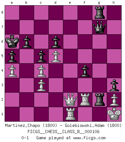Last move : 0-1 2010 June 20 21:24:18 [Event "FICGS__CHESS__CLASS_B__000106"] [Site "FICGS"] [Date "2010.04.07"] [Round "1"] [White "Martinez,Chapo"] [Black "Golebiowski,Adam"] [Result "0-1"] [WhiteElo "1800"] [BlackElo "1800"] 1.d4 e6 2.c4 Nf6 3.Nc3 Bb4 4.e3 c5 5.Nf3 Nc6 6.Bd3 Bxc3+ 7.bxc3 d6 8.O-O e5 9.Nd2 Qe7 10.d5 Nb8 11.f3 Nbd7 12.Qc2 b6 13.a4 a5 14.Qd1 g6 15.Qe2 Kd8 16.Rb1 Kc7 17.e4 Nh5 18.g3 Ng7 19.Nb3 f5 20.exf5 gxf5 21.Kh1 Ba6 22.Bh6 Nh5 23.Nd2 Qf6 24.Be3 Rae8 25.Qd1 f4 26.Ne4 Qh6 27.Bc1 Nhf6 28.Rb2 Rhg8 29.Nxf6 Qxf6 30.Rg2 h5 31.Qc2 Rg7 32.Qe2 h4 33.g4 h3 34.Rgf2 Qg5 35.Qc2 Nf6 36.Qe2 Bc8 37.Re1 Nxg4 38.fxg4 Bxg4 39.Qf1 Reg8 40.Be4 Bf5 41.Bxf5 Qxf5 42.Bxf4 exf4 43.Qe2 Qg5 44.Qf1 Qh4 45.Rfe2 Kb7 46.Rf2 Ka6 47.Rb1 Qh7 48.Re1 Rg2 49.Qe2 Qg7 0-1 Queen's pawn Kingside Castling by player White (move 8) Player Black won this chess game. Follow this game move after move (download)You cannot play at Chess if you are kind-hearted. (French Proverb) Ein Springer auf f6 gegen die eigene Rochadestellung ist schlimmer als ein rostiger Nagel im Knie. (Efim Bogoljubov) El Ajedrez es de 30 a 40 por ciento psicología. Uno no cuenta con esto cuando se juega contra una computadora. No lo puedo confundir. (Judith Polgar) Que feriez-vous si vous étiez en train de jouer aux échecs et que la fin du monde arrive ? Je continuerais à jouer. (Saint Borromée) Think like a man of action, act like a man of thought. (Henri Louis Bergson)