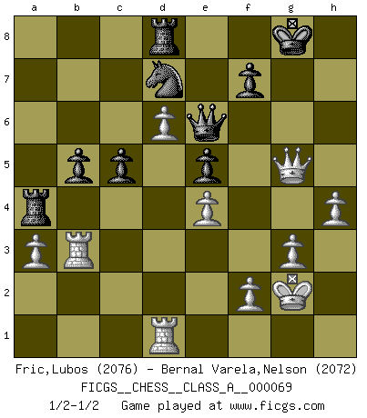 Last move : 1/2-1/2 2010 October 26 8:12:2 [Event "FICGS__CHESS__CLASS_A__000069"] [Site "FICGS"] [Date "2010.04.07"] [Round "1"] [White "Fric,Lubos"] [Black "Bernal Varela,Nelson"] [Result "1/2-1/2"] [WhiteElo "2076"] [BlackElo "2072"] 1.d4 Nf6 2.c4 g6 3.Nc3 d5 4.cxd5 Nxd5 5.g3 Bg7 6.Bg2 Nb6 7.Nf3 Nc6 8.e3 O-O 9.O-O Bg4 10.h3 Be6 11.b3 h6 12.Ne4 Qc8 13.Kh2 Nd7 14.Ba3 Rd8 15.Rc1 a5 16.Qe2 Nb4 17.Rfd1 Qb8 18.Ne1 c6 19.Nd3 Nxd3 20.Rxd3 Bf5 21.R3d1 Bxe4 22.Bxe4 e6 23.Bf3 Nb6 24.Bc5 Nd7 25.Be7 Re8 26.Ba3 Bf8 27.Bxf8 Rxf8 28.Kg2 Rd8 29.e4 Qd6 30.Qd2 Kg7 31.Qb2 Kh7 32.h4 h5 33.Qc3 Kg8 34.Rc2 Nb6 35.Qe3 a4 36.Rc5 Nd7 37.Rc3 Qe7 38.d5 axb3 39.d6 Qf6 40.Rxb3 b6 41.a3 e5 42.Qc1 Qe6 43.Qc2 b5 44.Rc3 Nb8 45.Rcd3 Ra4 46.Qc5 Kg7 47.Qe3 Nd7 48.Bxh5 c5 49.Rb3 gxh5 50.Qg5+ Kh7 51.Qxh5+ Kg8 52.Qg5+ 1/2-1/2 King's Indian defense, 3.Nc3 Kingside Castling by player Black (move 8) Kingside Castling by player White (move 9) This chess game ended in a draw. Follow this game move after move (download)One bad move nullifies forty good ones. (Horowitz) Ein Buch ist ein Spiegel; wenn ein Affe hineinsieht, so kann kein Apostel heraus gucken. (Georg Christoph Lichtenberg) Un jugador que es sorprendido, esta derrotado a medias. (Proverbio) Toutes les manuvres exécutées sur une colonne ouverte ont pour but ultime l'intrusion définitive sur la septième ou la huitième rangée, en plein cur de la position ennemie. (Aaron Nimzovitch) A good player is always lucky. (Capablanca)