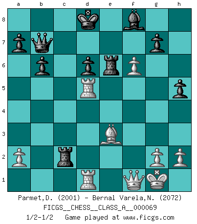 Last move : 1/2-1/2 2010 September 8 1:33:33 [Event "FICGS__CHESS__CLASS_A__000069"] [Site "FICGS"] [Date "2010.04.07"] [Round "1"] [White "Parmet,Daniel"] [Black "Bernal Varela,Nelson"] [Result "1/2-1/2"] [WhiteElo "2001"] [BlackElo "2072"] 1.e4 c5 2.Nf3 d6 3.Be2 Nf6 4.c3 Nc6 5.d4 cxd4 6.cxd4 Nxe4 7.d5 Qa5+ 8.Nc3 Nxc3 9.bxc3 Ne5 10.Nxe5 Qxc3+ 11.Bd2 Qxe5 12.O-O Qxd5 13.Rb1 e5 14.Bb5+ Bd7 15.Bxd7+ Kxd7 16.Qg4+ Kd8 17.Rfd1 Qc6 18.Be3 h5 19.Qb4 b6 20.f4 Ke8 21.Rbc1 Qd7 22.Rd5 Rh6 23.fxe5 Re6 24.Qc3 Qb7 25.Qd3 Rc8 26.Qb5+ Kd8 27.Rcd1 Rc2 28.Qf1 f6 29.exf6 1/2-1/2 Sicilian Kingside Castling by player White (move 12) This chess game ended in a draw. Follow this game move after move (download)Via the squares on the chessboard, the Indians explain the movement of time and the age, the higher influences which control the world and the ties which link Chess with the human soul. (Al-Masudi) Schach ist die gewalttätigste aller Sportarten. (Garry Kasparov) El Ajedrez es un expediente tonto que hace creer a la gente inactiva que hacen una cosa muy astuta cuando solamente estan perdiendo su tiempo. (George Bernard Shaw) Les Echecs représentent une sphère d'idées créatrices basée sur la volonté des deux protagonistes. (Smyslov) There are more things in heaven and earth than practically anywhere else. (Unknown)