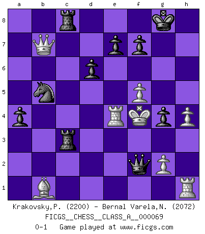 Last move : 0-1 2010 June 14 7:53:36 [Event "FICGS__CHESS__CLASS_A__000069"] [Site "FICGS"] [Date "2010.04.07"] [Round "1"] [White "Krakovsky,Peter"] [Black "Bernal Varela,Nelson"] [Result "0-1"] [WhiteElo "2200"] [BlackElo "2072"] 1.e4 c5 2.Nf3 d6 3.d4 cxd4 4.Nxd4 Nf6 5.Nc3 a6 6.Be3 Ng4 7.Bg5 h6 8.Bh4 g5 9.Bg3 Bg7 10.h3 Nf6 11.Qf3 Bd7 12.Nf5 Bxf5 13.exf5 Nc6 14.O-O-O Rc8 15.h4 g4 16.Qe3 O-O 17.Bf4 Nb4 18.Bxh6 Bxh6 19.Qxh6 Qa5 20.Qe3 Nxa2+ 21.Nxa2 Qxa2 22.c3 Rc5 23.Bd3 Rfc8 24.Qd4 a5 25.Rde1 a4 26.Bb1 Qa1 27.Qb4 Nd5 28.Qxb7 Nxc3 29.Kd2 Nb5 30.Re4 Qxb2+ 31.Ke3 Rc3+ 32.Kf4 Qxf2+ 0-1 Sicilian : Najdorf, Byrne (English) attack Queenside Castling by player White (move 14) Kingside Castling by player Black (move 16) Player Black won this chess game. Follow this game move after move (download)It's just you and your opponent at the board and you're trying to prove something. (Bobby Fischer) Ich rechne überhaupt nicht voraus. Ich gewinne auch so. (Robert James Fischer) De todos mis libros Rusos, la defensa contiene y difunde el 'calor' mas grande que pudiese verse extraño al observar lo supremamente abstracto que el Ajedrez supuestamente es. (Vladimir Nabokov) L'ordinateur a tué l'originalité. Il n'y a plus guère d'aventures sur l'échiquier. (Jacob Murray) There is no instance of a country having benefited from prolonged warfare. (Sun Tzu)