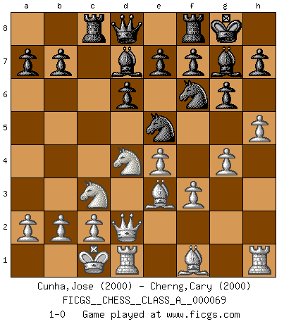 Last move : 1-0 2010 June 27 21:6:51 [Event "FICGS__CHESS__CLASS_A__000069"] [Site "FICGS"] [Date "2010.04.07"] [Round "1"] [White "Cunha,Jose"] [Black "Cherng,Cary"] [Result "1-0"] [WhiteElo "2000"] [BlackElo "2000"] 1.e4 c5 2.Nf3 d6 3.d4 cxd4 4.Nxd4 Nf6 5.Nc3 g6 6.Be3 Bg7 7.f3 Nc6 8.Qd2 O-O 9.O-O-O Bd7 10.g4 Rc8 11.h4 Ne5 12.h5 1-0 Sicilian : Dragon, Yugoslav attack Kingside Castling by player Black (move 8) Queenside Castling by player White (move 9) Player White won this chess game. Follow this game move after move (download)A win by an unsound combination, however showy, fills me with artistic horror. (Wilhelm Steinitz) Es ist wirklich schade, dass so viele Schachspieler nicht auf ihr Äußeres achten! (Alexandra Kosteniuk) Cuando tengas duda... ¡juega al Ajedrez!. (Tevis) À la honte des hommes, on sait que les lois du jeu sont les seules qui soient partout justes, claires, inviolables et exécutées. Pourquoi l'Indien qui a donné les règles du jeu d'échecs est-il obéi de bon gré dans toute la terre, et que les décrétales des papes, par exemple, sont aujourd'hui un objet d'horreur et de mépris ? C'est que l'inventeur des échecs combina tout avec justesse pour la satisfaction des joueurs, et que les papes, dans leurs décrétales, n'eurent en vue que leur seul avantage. L'Indien voulut exercer également l'esprit des hommes et leur donner du plaisir; les papes ont voulu abrutir l'esprit des hommes. Voltaire (Dictionnaire philosophique / Garnier 1967) My poor ole parrot... Is not in the circulation of displays ....poo hoo hoo :) (Wayne Lowrance's enigma)