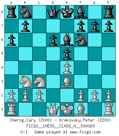 Last move : 0-1 2010 June 4 8:58:32 [Event "FICGS__CHESS__CLASS_A__000069"] [Site "FICGS"] [Date "2010.04.07"] [Round "1"] [White "Cherng,Cary"] [Black "Krakovsky,Peter"] [Result "0-1"] [WhiteElo "2000"] [BlackElo "2200"] 1.e4 c5 2.Nf3 d6 3.d4 cxd4 4.Nxd4 Nf6 5.Nc3 a6 6.Be3 e5 7.Nb3 Be6 0-1 This chess game has been lost on time (started : 2010.04.07 15:39:17) Sicilian : Najdorf, Byrne (English) attack Player Black won this chess game. Follow this game move after move (download)Bobby is the finest Chess player this country ever produced. His memory for the moves, his brilliance in dreaming up combinations, and his fierce determination to win are uncanny. (John Collins) Schach ist Krieg, im Schach geht es um testosterongesteuerte Urschreie. (Garry Kasparov) Peones: ellos son el alma de esta partida, solos forman el ataque y la defensa. (Philidor) Les Echecs ne sont pas pour les âmes timides. Ils requièrent un homme entier, qui ne s'arrête pas aveuglément à ce qui a été déjà établi, mais qui tente individuellement de sonder les profondeurs du jeu. (W. Steinitz) Thibault, I ask for draw. Game 13876. - Sorry Ilmars, you won. (FICGS chat)