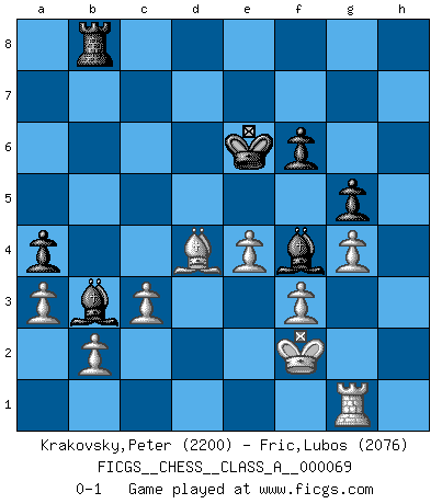 Last move : 0-1 2010 July 1 7:13:21 [Event "FICGS__CHESS__CLASS_A__000069"] [Site "FICGS"] [Date "2010.04.07"] [Round "1"] [White "Krakovsky,Peter"] [Black "Fric,Lubos"] [Result "0-1"] [WhiteElo "2200"] [BlackElo "2076"] 1.e4 c5 2.Nf3 d6 3.d4 cxd4 4.Nxd4 Nf6 5.Nc3 a6 6.Be3 e6 7.f3 b5 8.g4 h6 9.Qd2 b4 10.Nce2 e5 11.Nb3 a5 12.Rd1 a4 13.Nbc1 Be6 14.Nd3 Nc6 15.Nxb4 Nxb4 16.Qxb4 d5 17.Qc3 d4 18.Nxd4 exd4 19.Bxd4 Nd7 20.Bb5 Rb8 21.Bxd7+ Bxd7 22.a3 f6 23.O-O Be7 24.Rd2 Qc8 25.Rfd1 Kf7 26.Qxc8 Rbxc8 27.Kg2 h5 28.h3 hxg4 29.hxg4 Be6 30.Be3 Rb8 31.c3 Rb5 32.Bf4 g5 33.Bg3 Bc4 34.Kg1 Bb3 35.Rc1 Rd8 36.Rxd8 Bxd8 37.Bf2 Bc7 38.Be3 Rb8 39.Kf2 Rh8 40.Rg1 Ke6 41.Bc5 Bf4 42.Bd4 Rb8 0-1 Sicilian : Najdorf, Byrne (English) attack Kingside Castling by player White (move 23) Player Black won this chess game. Follow this game move after move (download)My opponents make good moves too. Sometimes I don't take these things into consideration. (Bobby Fischer) Mit sehr nachdenklichem Gesicht schreitet Bobby durch den Turniersaal. Was ist passiert?, fragt Lombardy. Ich stehe schlecht, antwortet Fischer. Lombardy: Dann biete doch einfach Remis an. Fischer: So schlecht stehe ich nun auch wieder nicht! (Robert James Fischer) El Ajedrez es la vida. (Bobby Fischer) La vie est comme un jeu d'échecs : nous esquissons un plan, mais celui-ci est tributaire de ce que daignent faire l'adversaire aux échecs et le destin dans la vie. (Arthur Schopenhauer) First of all, we have to go back to the classical time control. (Anatoly Karpov)