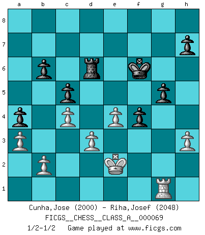 Last move : 1/2-1/2 2010 September 8 20:42:14 [Event "FICGS__CHESS__CLASS_A__000069"] [Site "FICGS"] [Date "2010.04.07"] [Round "1"] [White "Cunha,Jose"] [Black "Riha,Josef"] [Result "1/2-1/2"] [WhiteElo "2000"] [BlackElo "2048"] 1.e4 e5 2.Bb5 c6 3.Ba4 Nf6 4.Qe2 Bc5 5.Nf3 O-O 6.O-O d6 7.d3 Nbd7 8.Nc3 a5 9.Bb3 Bd4 10.a3 Nc5 11.Ba2 Be6 12.Be3 Bxe3 13.Qxe3 Bxa2 14.Rxa2 Ne6 15.Ne2 Re8 16.h3 Qc7 17.Ng3 d5 18.R2a1 Nf4 19.Rfe1 Rad8 20.Rad1 b6 21.exd5 N6xd5 22.Qe4 g6 23.Ne2 Nxe2+ 24.Qxe2 Kg7 25.Qe4 c5 26.c4 Nf6 27.Qe3 Nh5 28.g3 a4 29.Kh2 Nf6 30.Nd2 Qb7 31.Ne4 Nxe4 32.Qxe4 Qxe4 33.Rxe4 Re6 34.Kg2 f5 35.Re3 Kf6 36.Kf1 Rd4 37.Ke2 Red6 38.f3 f4 39.gxf4 exf4 40.Re4 Rxe4 41.fxe4 g5 42.Rg1 1/2-1/2 King's pawn game Kingside Castling by player Black (move 5) Kingside Castling by player White (move 6) This chess game ended in a draw. Follow this game move after move (download)When asked, -How is that you pick better moves than your opponents?, I responded: I'm very glad you asked me that, because, as it happens, there is a very simple answer. I think up my own moves, and I make my opponent think up his. (Alexander Alekhine) Modernes Schach sorgt sich zuviel um Dinge wie Bauernstruktur usw. Vergessen Sie das, Schachmatt beendet das Spiel! (Nigel Short) La captura del Rey enemigo es la finalidad pero no el primer objetivo de la partida. (William Steinitz) Le jeu d'échecs est comme rejeté hors du temps. (Antoine de Saint-Exupéry) The right perception of any matter and a misunderstanding of the same matter do not wholly exclude each other. (Kafka's the trial)