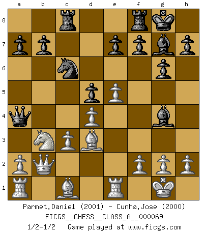 Last move : 1/2-1/2 2010 June 18 18:17:58 [Event "FICGS__CHESS__CLASS_A__000069"] [Site "FICGS"] [Date "2010.04.07"] [Round "1"] [White "Parmet,Daniel"] [Black "Cunha,Jose"] [Result "1/2-1/2"] [WhiteElo "2001"] [BlackElo "2000"] 1.e4 c5 2.Nf3 d6 3.Be2 Nc6 4.c3 g6 5.d4 cxd4 6.cxd4 Bg7 7.O-O Nf6 8.Nc3 d5 9.e5 Ne4 10.Re1 O-O 11.Bd3 Nxc3 12.bxc3 Qa5 13.Qc2 Bg4 14.Nd2 Rac8 15.Nb3 Qa4 16.Qb2 1/2-1/2 Sicilian Kingside Castling by player White (move 7) Kingside Castling by player Black (move 10) This chess game ended in a draw. Follow this game move after move (download)You know, comrade Pachman, I don't enjoy being a Minister, I would rather play Chess like you. (Che Guevara) Schach ist ein Teil der Kultur, und wenn es mit der Kultur abwärts geht, geht es auch mit dem Schach abwärts. (Mikhail Moiseyevich Botvinik) Aún el Rey más flojo huye despavorido ante la amenaza de un Jaque doble. (Aaron Nimzowitsch) Vous m'avez demandé de vous exposer quel est le fondement de la prière. Je ne fais que préparer les pièces du jeu sur la table... Nous sera-t-il permis d'en adopter les règles et si nous les appliquons scrupuleusement nous ne tarderons pas à faire mat le Roi divin ! Il ne pourra échapper à nos mains. (Sainte Thérèse d'Avila, Chemin de perfection) Always remember that you are unique; just like everyone else. (Unknown)