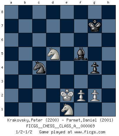 Last move : 1/2-1/2 2010 June 3 7:22:35 [Event "FICGS__CHESS__CLASS_A__000069"] [Site "FICGS"] [Date "2010.04.07"] [Round "1"] [White "Krakovsky,Peter"] [Black "Parmet,Daniel"] [Result "1/2-1/2"] [WhiteElo "2200"] [BlackElo "2001"] 1.e4 e5 2.Nf3 Nc6 3.Bb5 a6 4.Ba4 Nf6 5.O-O Be7 6.Re1 b5 7.Bb3 d6 8.c3 O-O 9.h3 Na5 10.Bc2 d5 11.exd5 e4 12.Bxe4 Nxe4 13.Rxe4 Bb7 14.d4 Re8 15.Bf4 Nc4 16.b3 Nb6 17.Qd3 Nxd5 18.Bg3 f5 19.Re1 f4 20.Bh2 c5 21.a4 cxd4 22.axb5 axb5 23.Rxa8 Qxa8 24.Nxd4 Bc5 25.Rxe8+ Qxe8 26.Qe2 Qxe2 27.Nxe2 g5 28.Kf1 Bc8 29.Nd2 Bf5 30.h4 h6 31.hxg5 hxg5 32.Nf3 g4 33.Ne1 Bd6 34.c4 bxc4 35.bxc4 Nb6 36.Bxf4 Bxf4 37.Nxf4 Nxc4 38.Ke2 Kg7 39.Nd5 1/2-1/2 Ruy Lopez : Closed Kingside Castling by player White (move 5) Kingside Castling by player Black (move 8) 10 pieces endgame at move 37 : White KNNPPP , Black KBNP WHITE : King + 2 Knights 3 Pawns BLACK : King + 1 Bishop 1 Knight 1 Pawn 9 pieces endgame at move 37 : White KNNPP , Black KBNP WHITE : King + 2 Knights 2 Pawns BLACK : King + 1 Bishop 1 Knight 1 Pawn This chess game ended in a draw. Follow this game move after move (download)The most important feature of the Chess position is the activity of the pieces. This is absolutely fundamental in all phases of the game: Opening, Middlegame and especially Endgame. The primary constraint on a piece's activity is the Pawn structure. (Michael Stean) Wer mein Gambit spielt, muß bereit sein, alle Brücken hinter sich abzubrechen. Es verändert den ganzen Menschen. Es wirkt wie ein Zauberstab und fördert verkümmerte, gute Charakter- eigenschaften wieder zu Tage. (Emil Joseph Diemer) Yo siempre he tenido un ligero sentimiento de lástima por una persona que no tiene conocimiento del Ajedrez. (Siegbert Tarrasch) Des points faibles ou des trous dans la position de l'adversaire doivent être occupés par des pièces et non pas par des pions. (Siegbert Tarrasch) Memory is a way of holding onto the things you love, the things you are, the things you never want to lose. (from the television show: The Wonder Years)