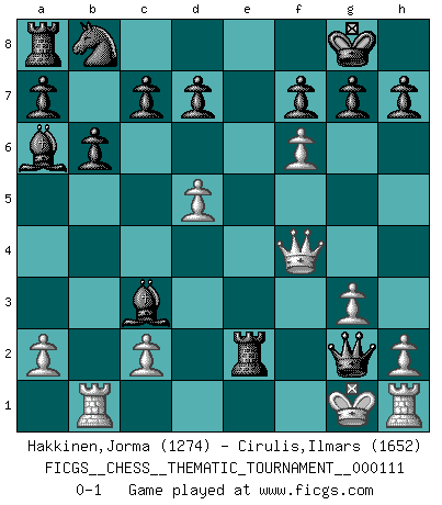 Last move : 0-1 2010 May 19 20:43:5 [Event "FICGS__CHESS__THEMATIC_TOURNAMENT__000111"] [Site "FICGS"] [Date "2010.04.07"] [Round "1"] [White "Hakkinen,Jorma"] [Black "Cirulis,Ilmars"] [Result "0-1"] [WhiteElo "1274"] [BlackElo "1652"] 1.e4 e5 2.f4 exf4 3.Nc3 Qh4+ 4.Ke2 Nf6 5.Nf3 Qh6 6.d4 b6 7.d5 Bc5 8.e5 O-O 9.exf6 Re8+ 10.Kd3 Ba6+ 11.Kd2 Be3+ 12.Ke1 Bxc1 13.Be2 Bxb2 14.Rb1 Bxc3+ 15.Kf2 Rxe2+ 16.Kg1 Qg6 17.g3 Qe4 18.Qc1 Qxf3 19.Qxf4 Qg2+ 0-1 KGA : Keres (Mason-Steinitz) gambit Kingside Castling by player Black (move 8) Player Black won this chess game. Follow this game move after move (download)Bobby Fischer is the greatest Chess player who has ever lived. (Ken Smith) Ich würde mich als ganz normalen Jungen bezeichnen [Im Alter von 12]. (Sergej Karjakin) El pensamiento metódico es mas útil en el Ajedrez que la inspiración. (C. J. S. Purdy) Les Echecs ont trois composantes : le temps, l'espace et le matériel en dernier. (Mikhail Tal) Now be brave and don't look back. Don't look back. (Shmi Skywalker in Star Wars ep.1)