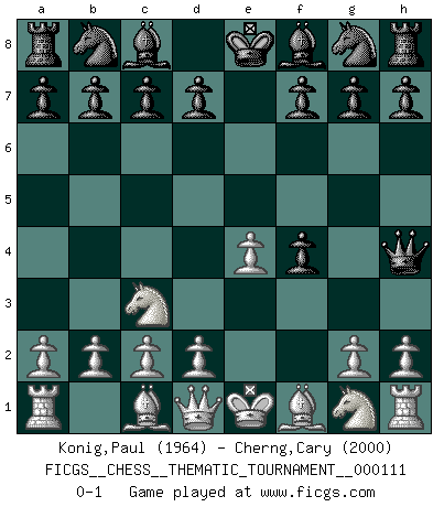 Last move : 0-1 2010 April 8 23:23:7 [Event "FICGS__CHESS__THEMATIC_TOURNAMENT__000111"] [Site "FICGS"] [Date "2010.04.07"] [Round "1"] [White "Konig,Paul"] [Black "Cherng,Cary"] [Result "0-1"] [WhiteElo "1964"] [BlackElo "2000"] 1.e4 e5 2.f4 exf4 3.Nc3 Qh4+ 0-1 KGA : Keres (Mason-Steinitz) gambit Player Black won this chess game. Follow this game move after move (download)Chess is a matter of delicate judgment, knowing when to punch and how to duck. (Bobby Fischer) Kostenjuk hat keinen Sexappeal. (Loek van Wely) El Ajedrez es el gimnasio de la mente. (Blaise Pascal) Je fais ceci parce que dans cinquante coups j'obtiendrai cela; je m'appelle Mikhail Moisevitch Botvinnik. (Botvinnik) A mistake is only a mistake if you let it happen twice. Otherwise it is a learning experience. (Daniel Parmet)