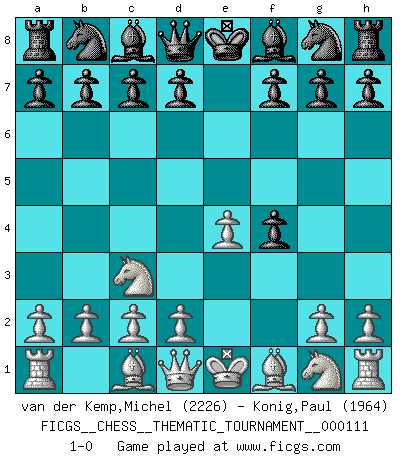 Last move : 1-0 2010 April 8 23:24:23 [Event "FICGS__CHESS__THEMATIC_TOURNAMENT__000111"] [Site "FICGS"] [Date "2010.04.07"] [Round "1"] [White "van der Kemp,Michel"] [Black "Konig,Paul"] [Result "1-0"] [WhiteElo "2226"] [BlackElo "1964"] 1.e4 e5 2.f4 exf4 3.Nc3 1-0 KGA : Keres (Mason-Steinitz) gambit Player White won this chess game. Follow this game move after move (download)Fischer, who may or may not be mad as a hatter, has every right to be horrified. (Jeremy Silman) Die Leute spielen gegen mich seit 15 Jahren unter Ihren Möglichkeiten. (Robert James Fischer) El Ajedrez es una guerra en un tablero. El objetivo es aplastar la mente del oponente. (Bobby Fischer) On entre au jeu d'Echecs comme on entre en Religion. Pour le joueur d'Echecs, la partie d'Echecs c'est l'office, la messe, le défilé du 1er Mai, le dépôt de gerbe au Monument aux Morts. C'est un drame sacré. (Michel Roos) Political correctness is subjecting us to gross incompetence. (Johann Piek)