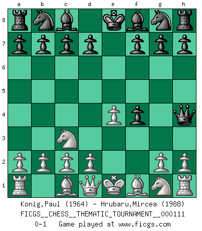 Last move : 0-1 2010 April 8 23:23:27 [Event "FICGS__CHESS__THEMATIC_TOURNAMENT__000111"] [Site "FICGS"] [Date "2010.04.07"] [Round "1"] [White "Konig,Paul"] [Black "Hrubaru,Mircea"] [Result "0-1"] [WhiteElo "1964"] [BlackElo "1988"] 1.e4 e5 2.f4 exf4 3.Nc3 Qh4+ 0-1 KGA : Keres (Mason-Steinitz) gambit Player Black won this chess game. Follow this game move after move (download)As one by one I mowed them down, my superiority soon became apparent. (Jose Capablanca) Frage des Reporters: -Worin besteht das Ziel von Gambiteröffnungen? Antwort: -Auf Kosten der Partie einen Ruf als Angriffspieler zu erwerben.- (Siegbert Tarrasch) Un jugador que es sorprendido, esta derrotado a medias. (Proverbio) Le succès, c'est être capable d'aller d'échec en échec sans perdre son enthousiasme. (Winston Churchill) The only thing that matters is the evidence. (Horatio Caine, C.S.I. Miami)