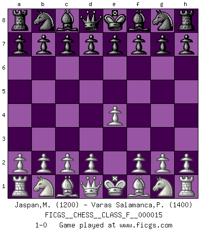Last move : 1-0 2006 December 11 11:55:8 [Event "FICGS__CHESS__CLASS_F__000015"] [Site "FICGS"] [Date "2006.10.27"] [Round "1"] [White "Jaspan,Mark"] [Black "Varas Salamanca,Pablo"] [Result "1-0"] [WhiteElo "1200"] [BlackElo "1400"] 1.e4 1-0 This chess game has been lost on time (started : 2006.10.27 15:55:49) King's pawn Opening Player White won this chess game. Follow this game move after move (download)The Pin is mightier than the sword. (Fred Reinfeld) Wer nie einen Fehler gemacht hat, hat nie etwas Neues ausprobiert. (Albert Einstein) Si pudieramos observar el interior de la cabeza de un jugador de Ajedrez, encontraríamos ahí un mundo lleno de sentimientos, imágenes, ideas, emoción y pasión. (Alfred Binet) Pour moi, les échecs ne sont pas un jeu mais un art. (Alexandre Alekhine) Tomorrow's what you make of it. (Horatio Caine, C.S.I. Miami)