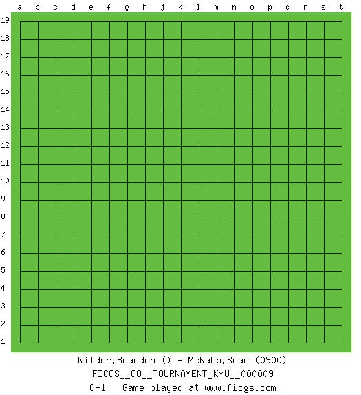 Last move : 0-1 2006 November 28 10:10:58 [Event "FICGS__GO__TOURNAMENT_KYU__000009"] [Site "FICGS"] [Date "2006.10.29"] [Round "1"] [Black "Wilder,Brandon"] [White "McNabb,Sean"] [Result "0-1"] [Rating 2 "0900"] 0-1 This go game has been lost on time (started : 2006.10.29 8:26:48) Here are the names of the openings (joseki) played in the four corners : Player White won this Go (weiqi, baduk) game. Follow this game move after move (download)The poor player plays the opponent's game for him. (Anonymous) Being number two sucks. (Andre Agassi)