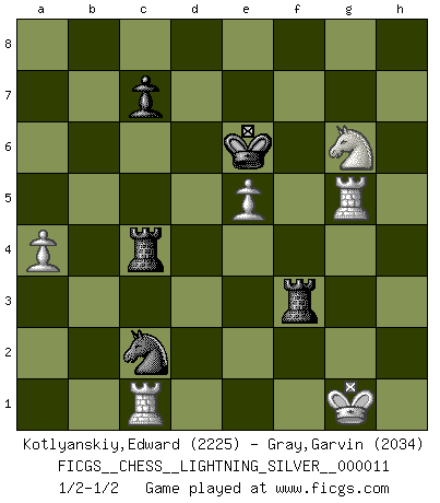 Last move : 1/2-1/2 2010 April 8 6:48:16 [Event "FICGS__CHESS__LIGHTNING_SILVER__000011"] [Site "FICGS"] [Date "2010.04.08"] [Round "1"] [White "Kotlyanskiy,Edward"] [Black "Gray,Garvin"] [Result "1/2-1/2"] [WhiteElo "2225"] [BlackElo "2034"] 1.e4 d5 2.exd5 Nf6 3.d4 Nxd5 4.Nf3 Bg4 5.Be2 e6 6.O-O Be7 7.c4 Nb6 8.Nc3 O-O 9.h3 Bh5 10.Qb3 Bxf3 11.Bxf3 Nc6 12.Bxc6 bxc6 13.Ne2 Qc8 14.Bf4 Qa6 15.Rfc1 Bd6 16.Qg3 Rad8 17.b3 Rfe8 18.c5 Bxf4 19.Nxf4 Nd5 20.Rc4 Qb7 21.Re1 a6 22.Ra4 Re7 23.Nh5 g6 24.Nf4 Qb5 25.Nd3 f6 26.h4 Kg7 27.h5 g5 28.Nb2 Kh6 29.Qh3 Rg8 30.Nc4 g4 31.Qd3 Rg5 32.Re4 Kg7 33.Ra5 Qb8 34.Qg3 f5 35.Re1 Rxh5 36.f3 Rg5 37.Ne5 Qb4 38.Ra4 Qc3 39.Qh4 h6 40.fxg4 Ne3 41.Re2 Nxg4 42.Nf3 Qd3 43.Qe1 f4 44.Qd2 Qxd2 45.Rxd2 Rd5 46.Re2 e5 47.Re4 h5 48.Rxa6 Kg6 49.dxe5 Rxc5 50.Re1 Rc3 51.Ra8 c5 52.Rg8+ Kf7 53.Rg5 Ne3 54.Nh4 Ke6 55.Ng6 Rf7 56.Rxh5 f3 57.gxf3 Rxf3 58.Rg5 Nc2 59.Rc1 c4 60.bxc4 Rxc4 61.a4 1/2-1/2 Scandinavian : Marshall variation Kingside Castling by player White (move 6) Kingside Castling by player Black (move 8) This chess game ended in a draw. Follow this game move after move (download)As one by one I mowed them down, my superiority soon became apparent. (Jose Capablanca) Ihnen, Herr Lasker, habe ich nur drei Worte zu sagen: Schach und matt. (Siegbert Tarrasch) Coloca el contenido del tablero de Ajedrez en un sombrero, agita las piezas vigorosamente, derrámalas en el tablero desde una altura de medio metro y así obtienes el estilo de Wilhelm Steinitz. (H. E. Bird) Même un GMI sait rarement calculer sur plus de cinq coups une attaque à sacrifices. (Rudolf Spielmann) This is where the fun begins. (Anakin Skywalker in Star Wars ep.3)