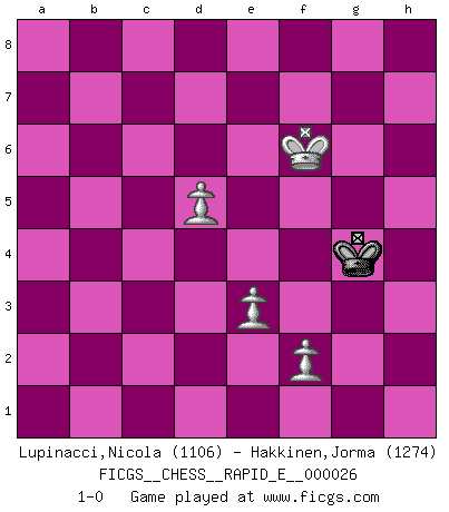 Last move : 1-0 2010 June 28 23:45:56 [Event "FICGS__CHESS__RAPID_E__000026"] [Site "FICGS"] [Date "2010.04.09"] [Round "1"] [White "Lupinacci,Nicola"] [Black "Hakkinen,Jorma"] [Result "1-0"] [WhiteElo "1106"] [BlackElo "1274"] 1.b4 c6 2.Bb2 d5 3.e3 Bf5 4.c4 Nf6 5.Nf3 Nbd7 6.Nc3 e6 7.Nh4 Bxb4 8.Nxf5 exf5 9.cxd5 cxd5 10.Qb3 a5 11.Bb5 O-O 12.Bxd7 Qxd7 13.a3 Bxc3 14.Bxc3 Ne4 15.O-O Nxc3 16.Qxc3 b5 17.Rac1 Rac8 18.Qb2 Rxc1 19.Rxc1 Rc8 20.Rxc8+ Qxc8 21.d3 g6 22.g3 Qc5 23.Kg2 b4 24.axb4 Qxb4 25.Qe5 a4 26.Qe8+ Kg7 27.Qe5+ Kg8 28.Qe8+ Qf8 29.Qxa4 h5 30.Qc6 Qd8 31.d4 g5 32.Qh6 h4 33.gxh4 gxh4 34.Kh3 Qe7 35.Qxh4 Qxh4+ 36.Kxh4 Kg7 37.Kg5 f6+ 38.Kxf5 Kf7 39.h4 Kg7 40.Ke6 Kg6 41.Kxd5 Kh5 42.Ke6 Kxh4 43.Kxf6 Kg4 44.d5 1-0 Polish : Outflank variation Kingside Castling by player Black (move 11) Kingside Castling by player White (move 15) 10 pieces endgame at move 35 : White KPPPP , Black KQPPP WHITE : King + 4 Pawns BLACK : King + 1 Queen 3 Pawns 9 pieces endgame at move 36 : White KPPPP , Black KPPP WHITE : King + 4 Pawns BLACK : King + 3 Pawns 8 pieces endgame at move 38 : White KPPPP , Black KPP WHITE : King + 4 Pawns BLACK : King + 2 Pawns 7 pieces endgame at move 41 : White KPPPP , Black KP WHITE : King + 4 Pawns BLACK : King + 1 Pawn 6 pieces endgame at move 42 : White KPPP , Black KP WHITE : King + 3 Pawns BLACK : King + 1 Pawn 5 pieces endgame at move 43 : White KPPP , Black K WHITE : King + 3 Pawns BLACK : King + Player White won this chess game. Follow this game move after move (download)If I win a tournament, I win it by myself. I do the playing. Nobody helps me. (Bobby Fischer) Wenn ich einen Club besuche, sind die Spieler stumm vor Staunen. (José Raúl Capablanca) Vive, pierde y aprende al observar a tu oponente como ganar. (Amber Steenbock) On a dit que l'homme se distingue de l'animal par le fait qu'il achète plus de livres qu'il ne peut en lire. Je voudrais suggérer qu'inclure à la liste des livres quelques livres d'échecs rendrait la distinction manifeste. (Edward Lasker) Coffee just isn't my cup of tea. (Unknown)