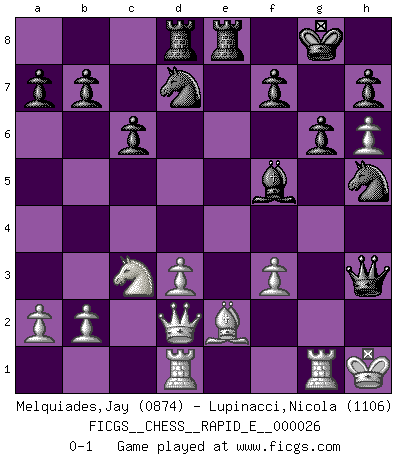 Last move : 0-1 2010 April 13 0:41:2 [Event "FICGS__CHESS__RAPID_E__000026"] [Site "FICGS"] [Date "2010.04.09"] [Round "1"] [White "Melquiades,Jay"] [Black "Lupinacci,Nicola"] [Result "0-1"] [WhiteElo "0874"] [BlackElo "1106"] 1.e4 c6 2.d3 d5 3.Ne2 dxe4 4.Nbc3 exd3 5.cxd3 Bf5 6.Nf4 Nf6 7.Be2 e5 8.O-O exf4 9.Bxf4 Bd6 10.Bxd6 Qxd6 11.Re1 O-O 12.h4 Nbd7 13.Qc2 Rfe8 14.Rad1 Rad8 15.h5 Qc7 16.h6 g6 17.g4 Bxg4 18.f3 Bf5 19.Qd2 Qg3+ 20.Kh1 Nh5 21.Rg1 Qh3+ 0-1 Caro-Kann : Closed (Breyer) variation Kingside Castling by player White (move 8) Kingside Castling by player Black (move 11) Player Black won this chess game. Follow this game move after move (download)There are two classes of men; those who are content to yield to circumstances and who play whist; those who aim to control circumstances, and who play Chess. (Mortimer Collins) Was ist der Unterschied zwischen einem Strassenarbeiter und einem Schachspieler? --Der Schachspieler bewegt sich ab und zu. (Anonymous) Un juego de Ajedrez es un dialogo, una conversación entre un jugador y su oponente. Cada movimiento del oponente puede contener amenazas o tropiezos, pero un jugador no se puede defender de las amenazas o tomar ventaja de los tropiezos si es que no se pregunta a sí mismo: ¿Que es lo que mi oponente va a hacer después de cada movida?. (Bruce A. Moon) Les Echecs mettent en conflit, non pas deux intelligences, mais deux volontés. (Lasker) The difference between stupidity and genius is that genius has its limits. (Murphy)
