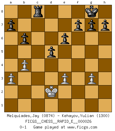 Last move : 0-1 2010 April 22 19:58:15 [Event "FICGS__CHESS__RAPID_E__000026"] [Site "FICGS"] [Date "2010.04.09"] [Round "1"] [White "Melquiades,Jay"] [Black "Kehayov,Yulian"] [Result "0-1"] [WhiteElo "0874"] [BlackElo "1300"] 1.e4 d5 2.e5 e6 3.d4 b6 4.Nf3 c5 5.Nc3 cxd4 6.Nxd4 Qc7 7.Bb5+ Bd7 8.Bxd7+ Qxd7 9.O-O Nc6 10.Nxc6 Qxc6 11.Be3 Bc5 12.Qd2 Ne7 13.Bxc5 Qxc5 14.Rac1 O-O 15.a3 Ng6 16.b4 Qc4 17.Rfd1 Nxe5 18.Ne2 Qg4 19.Nf4 Nf3+ 20.Kf1 Nxd2+ 21.Rxd2 Qxf4 22.Rcd1 Rac8 23.g3 Qf3 24.Rd3 Qh1+ 25.Ke2 Qxh2 26.Rf3 Rxc2+ 27.Rd2 Rxd2+ 28.Kxd2 Qh6+ 29.Re3 Qxe3+ 30.fxe3 Rc8 0-1 Scandinavian (centre counter) defense Kingside Castling by player White (move 9) Kingside Castling by player Black (move 14) Player Black won this chess game. Follow this game move after move (download)In a gambit you give up a Pawn for the sake of getting a lost game. (Samuel Standige Boden) Wenn Dein Gegner dir ein Remis anbietet, versuch herauszufinden, weshalb er glaubt schlechter zu stehen. (Nigel Short) El Ajedrez es tan inspirador que yo no creo que un buen jugador sea capaz de tener un pensamiento malo durante una partida. (Wilhelm Steinitz) Les échecs c'est le défi de l'alpiniste, toujours plus haut, prêt à tout pour monter à l'assaut du Roi ennemi. Les échecs, c'est de la musique en mouvement, un ballet majestueux pour les yeux. C'est de la poésie composée par les fantômes du passé qui au même titre que Rimbaud ou Verlaine méritent notre admiration. Les échecs, c'est de la peinture ou le moindre mouvement modifie le tableau pour en faire un Picasso ou un Van Gogh. Les échecs, c'est tout et rien, c'est la vie et la mort. Jjulie33 sur le forum de France-Echecs. Computers are like Old Testament gods; lots of rules and no mercy. (Joseph Campbell)