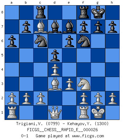 Last move : 0-1 2010 May 29 20:45:59 [Event "FICGS__CHESS__RAPID_E__000026"] [Site "FICGS"] [Date "2010.04.09"] [Round "1"] [White "Trigiani,Vincenzo"] [Black "Kehayov,Yulian"] [Result "0-1"] [WhiteElo "0799"] [BlackElo "1300"] 1.d4 d5 2.Bf4 Nc6 3.Nc3 e6 4.Nb5 a6 5.Nxc7+ Qxc7 6.Bxc7 Nf6 7.Nf3 Be7 8.e3 O-O 9.Bd3 Bd7 10.O-O Rac8 0-1 This chess game has been lost on time (started : 2010.04.09 15:2:24) Queen's pawn, Mason variation Kingside Castling by player Black (move 8) Kingside Castling by player White (move 10) Player Black won this chess game. Follow this game move after move (download)The Chess pieces are the block alphabet which shapes thoughts; and these thoughts, although making a visual design on the chessboard, express their beauty abstractly, like a poem. (Marcel Duchamp) Privat ist Kortschnoi kein schlechter Mensch, sehr sympathisch. Aber während des Spiels ist er grausam. Er will dich töten. (Miguel Najdorf) EL Ajedrez es como la vida. (Boris Spassky) La tactique, c'est ce que vous faites quand il y a quelque chose à faire; la stratégie, c'est ce que vous faites quand il n'y a rien à faire. (Savielli Tartacower) Life is verb, not a noun. (Charlotte Perkins Gilman)
