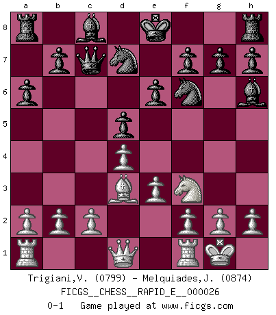 Last move : 0-1 2010 May 24 8:34:49 [Event "FICGS__CHESS__RAPID_E__000026"] [Site "FICGS"] [Date "2010.04.09"] [Round "1"] [White "Trigiani,Vincenzo"] [Black "Melquiades,Jay"] [Result "0-1"] [WhiteElo "0799"] [BlackElo "0874"] 1.d4 d5 2.Bf4 e6 3.Nc3 Bd6 4.Nb5 Bxf4 5.Nxc7+ Qxc7 6.e3 Bh6 7.Nf3 Nf6 8.Bd3 a6 9.O-O Nbd7 0-1 This chess game has been lost on time (started : 2010.04.09 15:2:24) Queen's pawn, Mason variation Kingside Castling by player White (move 9) Player Black won this chess game. Follow this game move after move (download)Tactics flow from a superior position. (Bobby Fischer) Die Arbeit ist etwas Unnatürliches. Die Faulheit allein ist göttlich. (Anatole France) El Ajedrez es parte de una cultura y si una cultura esta en decadencia, entonces también el Ajedrez declinará. (Mikhail Botvinnik) Un millionnaire : 'Monsieur Steinitz ! Vous ne participez aux tournois que pour l'argent, alors que moi je n'y viens que pour l'honneur.' Steinitz : 'Chacun joue pour ce qu'il n'a pas'... Have no fear of perfection - you'll never reach it. (Salvador Dali)