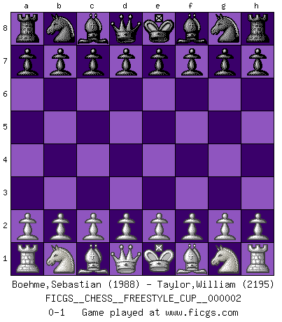 Last move : 0-1 2010 April 10 13:12:56 [Event "FICGS__CHESS__FREESTYLE_CUP__000002"] [Site "FICGS"] [Date "2010.04.10"] [Round "1"] [White "Boehme,Sebastian"] [Black "Taylor,William"] [Result "0-1"] [WhiteElo "1988"] [BlackElo "2195"] 0-1 Player Black won this chess game. Follow this game move after move (download)Chess teaches you to control the initial excitement you feel when you see something that looks good and it trains you to think objectively when you're in trouble. (Stanley Kubrick) Ein typischer, sehr verbreiteter Gedankenschädling ist der, daß der betreffende Amateur von der Annanhme ausgeht, daß jeder einzelne Zug etwas zu leisten habe. (Aaron Nimzowitsch) Solo el jugador con la iniciativa tiene el derecho a atacar. (Wilhelm Steinitz) La menace est plus forte que l'exécution. (Aaron Nimzovitch) There are two major products that came out of Berkeley: LSD and UNIX. We do not believe this is to be a coincidence. (Jeremy S. Anderson)