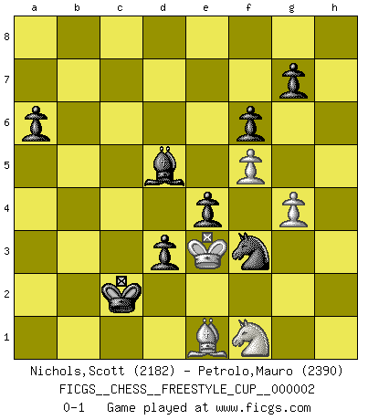 Last move : 0-1 2010 April 10 19:17:56 [Event "FICGS__CHESS__FREESTYLE_CUP__000002"] [Site "FICGS"] [Date "2010.04.10"] [Round "1"] [White "Nichols,Scott"] [Black "Petrolo,Mauro"] [Result "0-1"] [WhiteElo "2182"] [BlackElo "2390"] 1.e4 c5 2.d4 cxd4 3.c3 dxc3 4.Nxc3 Nc6 5.Nf3 e6 6.Bd3 Nf6 7.O-O d6 8.Bg5 Be7 9.Qd2 h6 10.Be3 Ng4 11.Bf4 e5 12.Bg3 Nf6 13.h3 Be6 14.Rac1 O-O 15.Bb1 Qa5 16.Rfd1 Rac8 17.a3 Rfd8 18.Qe2 a6 19.Qe3 Nb8 20.Qd2 Rc6 21.Nd5 Qxd2 22.Nxe7+ Kf8 23.Nxd2 Kxe7 24.f4 Nh5 25.Bh4+ f6 26.f5 Bf7 27.Rxc6 Nxc6 28.Bf2 Nf4 29.Bb6 Rc8 30.Kh2 Nb8 31.Be3 Ne2 32.Nf3 Nc6 33.Bb6 Bb3 34.Rd3 Ba4 35.Rd2 Nc1 36.Kg1 Nb8 37.Be3 Nb3 38.Re2 Nd7 39.Re1 Bb5 40.g4 Nbc5 41.Rc1 Rc6 42.Kg2 Na4 43.Rxc6 bxc6 44.b3 Nac5 45.b4 Na4 46.Bc2 Nab6 47.Bc1 d5 48.exd5 cxd5 49.Nd2 Na4 50.Kf2 Ndb6 51.Nf1 d4 52.Ng3 Nc4 53.Ke1 Nc3 54.Bb3 Nd6 55.Bb2 Bc4 56.Bc2 Nd5 57.Bc1 d3 58.Bd1 e4 59.Nf1 Ba2 60.Ba4 Nc3 61.Bc6 Bd5 62.Bd2 Bxc6 63.Bxc3 Nc4 64.Bd4 Nxa3 65.Bc5+ Kf7 66.Kd2 Kg8 67.Ne3 h5 68.b5 Nxb5 69.Nc4 h4 70.Bf2 Kf7 71.Ke3 Ke7 72.Be1 Kd7 73.Bb4 Bd5 74.Nd2 Nd6 75.Kd4 Kc6 76.Nb1 Nf7 77.Ke3 Ng5 78.Be1 Nxh3 79.Bxh4 Ng5 80.Be1 Kb5 81.Nc3+ Kc4 82.Nb1 Kb3 83.Nd2+ Kc2 84.Nf1 Nf3 0-1 Sicilian : Smith-Morra gambit Kingside Castling by player White (move 7) Kingside Castling by player Black (move 14) Player Black won this chess game. Follow this game move after move (download)Any material change in a position must come about by mate, a capture, or a Pawn promotion. (Purdy) Es hat in meinem Leben Zeiten gegeben, da ich sehr nahe daran war zu glauben, daß ich auch nicht eine einzige Schachpartie verlieren könnte. (José Raúl Capablanca) En posiciones complicadas, Bobby Fischer pocas veces tuvo que temer de cualquiera. (Paul Keres) Les échecs c'est le défi de l'alpiniste, toujours plus haut, prêt à tout pour monter à l'assaut du Roi ennemi. Les échecs, c'est de la musique en mouvement, un ballet majestueux pour les yeux. C'est de la poésie composée par les fantômes du passé qui au même titre que Rimbaud ou Verlaine méritent notre admiration. Les échecs, c'est de la peinture ou le moindre mouvement modifie le tableau pour en faire un Picasso ou un Van Gogh. Les échecs, c'est tout et rien, c'est la vie et la mort. Jjulie33 sur le forum de France-Echecs. But they are useless. They can only give you answers. (Pablo Picasso, about computers)