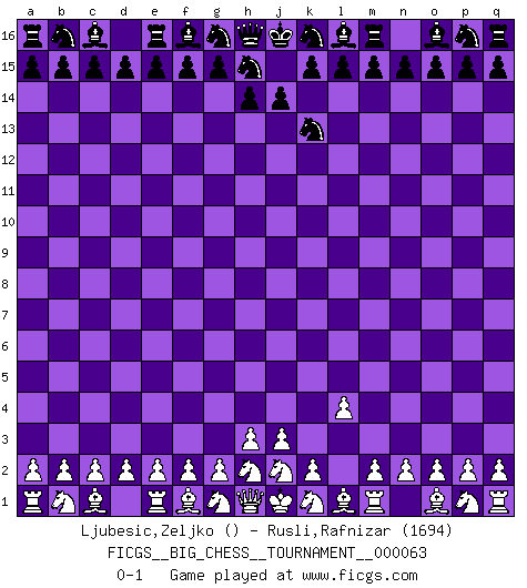 Last move : 0-1 2010 May 29 8:44:45 [Event "FICGS__BIG_CHESS__TOURNAMENT__000063"] [Site "FICGS"] [Date "2010.04.10"] [Round "1"] [White "Ljubesic,Zeljko"] [Black "Rusli,Rafnizar"] [Result "0-1"] [WhiteElo ""] [BlackElo "1694"] 1.l2-l4 j15-k13 0-1 This big chess game has been lost on time (started : 2010.04.10 21:32:45) Follow this game move after move (download)One bad move nullifies forty good ones. (Horowitz) Wer der Ansicht ist, daß alle Schachspieler verrückt sind, wird durch Studium des Lebens von Emil Josef Diemer nicht auf andere Gedanken kommen. (Hans Ree) Un buen sacrificio es aquel que aunque no sea necesariamente sólido, deja a tu oponente aturdido y confuso. (Rudolph Spielmann) Les échecs, c'est la lutte contre l'erreur. (Johannes Zukertort) As the days dwindle down... to a precious few. (Maxwell Anderson)