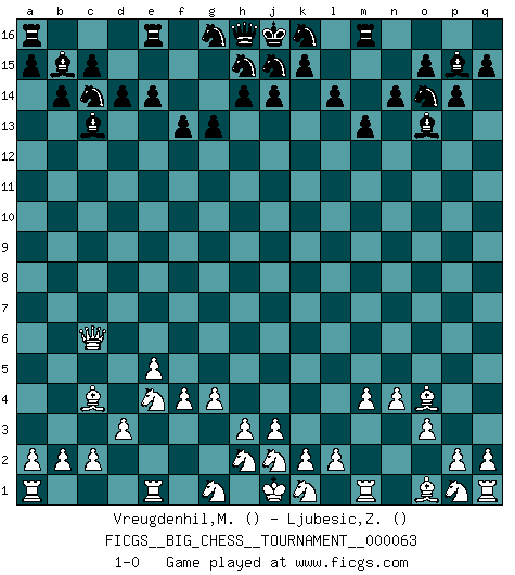Last move : 1-0 2010 June 7 9:18:48 [Event "FICGS__BIG_CHESS__TOURNAMENT__000063"] [Site "FICGS"] [Date "2010.04.10"] [Round "1"] [White "Vreugdenhil,Maarten"] [Black "Ljubesic,Zeljko"] [Result "1-0"] [WhiteElo ""] [BlackElo ""] 1.g2-g4 f15-f13 2.f2-f4 g15-g13 3.h1-a8 e15-e14 4.b1-c3 b15-b14 5.e2-e4 c16-b15 6.o2-o3 p15-p14 7.n2-n4 o16-p15 8.a8-c6 f16-c13 9.m2-m4 l15-l14 10.f1-c4 m15-m13 11.l1-o4 d15-d14 12.e4-e5 l16-o13 13.d2-d3 n15-n14 14.c1-e3 b16-c14 15.e3-b6 p16-o14 16.b6-m16 q16-m16 17.c3-e4 1-0 This big chess game has been lost on time (started : 2010.04.10 21:32:45) Follow this game move after move (download)You must take your opponent into a deep dark forest where 2+2=5, and the path leading out is only wide enough for one. (Mikhail Tal) Im Blitz ist es einfacher mit einer Figur weniger anzugreifen, als sich mit einer Mehrfigur zu verteidigen. (Mikhail Nekhemyevich Tal) Las Aperturas te enseñan aperturas. ¡Los Finales te enseñan Ajedrez!. (Stephan Gerzadowicz) Le pion, dans sa simplicité, marche droit devant lui, mais lorsqu'il prend, il le fait obliquement? Ainsi l'homme, tant qu'il reste pauvre, marche dans la droiture et vit honnêtement, mais lorsqu'il recherche les honneurs, il flatte, se parjure et, par les voies obliques, cherche une position supérieure sur l'échiquier du monde. (Jean de Galles) You think that education is too expensive ? Try ignorance. (Derek Bok)
