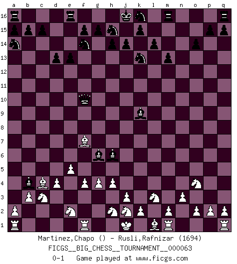 Last move : 0-1 2010 June 29 20:56:19 [Event "FICGS__BIG_CHESS__TOURNAMENT__000063"] [Site "FICGS"] [Date "2010.04.10"] [Round "1"] [White "Martinez,Chapo"] [Black "Rusli,Rafnizar"] [Result "0-1"] [WhiteElo ""] [BlackElo "1694"] 1.g2-g4 e15-e13 2.n2-n3 j15-k13 3.h1-d5 p16-o14 4.b2-b3 h16-n11 5.c1-b2 g16-f14 6.e2-e3 d15-d13 7.b2-o14 n15-o14 8.d5-o15 m15-m13 9.o15-q13 n11-l11 10.b1-c3 l11-l2 11.k1-l3 f16-b12 12.q13-h5 l2-p6 13.p1-n2 b16-a14 14.n2-o4 p6-p9 15.f1-b5 c16-g12 16.h5-j5 b12-j5 17.h3-h4 j5-g7 18.g1-e2 p9-b9 19.o1-f9 o16-d6 20.f9-d7 b9-d9 21.d2-d4 l16-o13 22.e3-e4 d9-c10 23.e4-e5 d6-b4 24.b5-c4 o13-c2 25.d7-e6 l15-l14 26.e1-c1 g12-k9 27.e6-f7 c10-f10 28.f2-f4 g7-h6 29.c1-f1 c2-g6 0-1 Follow this game move after move (download)A passed Pawn increases in strength as the number of pieces on the board diminishes. (Capablanca) Im Schach gibt es keinen Platz für Galanterie. (Irving Chernev) Un buen jugador siempre tiene buena suerte. (José Raúl Capablanca) L'action d'une oeuvre littéraire se déroule sur un champ de bataille. Les masques et les types du drame moderne correspondent aux pièces du jeu d'échecs. L'intrigue correspond aux coups et aux gambits, c'est à dire aux techniques du jeu telles qu'utilisées et interprétées par les joueurs. Les tactiques et les péripéties [mouvements] correspondent aux coups exécutés par l'adversaire. (Viktor Shklovsky) Macintosh - we might not get everything right, but at least we knew the century was going to end. (Douglas Adams)