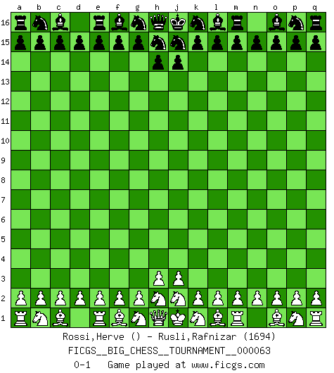 Last move : 0-1 2010 May 13 19:51:18 [Event "FICGS__BIG_CHESS__TOURNAMENT__000063"] [Site "FICGS"] [Date "2010.04.10"] [Round "1"] [White "Rossi,Herve"] [Black "Rusli,Rafnizar"] [Result "0-1"] [WhiteElo ""] [BlackElo "1694"] 0-1 This big chess game has been lost on time (started : 2010.04.10 21:32:45) Follow this game move after move (download)Of all my Russian books, the defense contains and diffuses the greatest 'warmth' which may seem odd seeing how supremely abstract Chess is supposed to be. (Vladimir Nabokov) Der Traum, für den ich lebe, ist der von einem freien Russland. Viele mögen sagen: Russland hat doch ein Parlament, einen gewählten Präsidenten. Aber ich spüre, dass in meiner Heimat die Angst wiederkehrt. Eine Angst, sich frei zu äußern, bestimmte Dinge zu tun (Garry Kasparov) El jugador táctico sabe que hacer cuando hay algo que hacer; mientras que el estratega sabe que hacer cuando no hay nada que hacer. (Gerald Abrahams) Plusieurs personnes se sont demandées comment Tal faisait pour gagner... En fait, c'est très simple ! Il met ses pièces au centre de l'échiquier et les sacrifie quelque part ! (David Bronstein) To err is human, but to really foul things up requires a computer. (Farmer's Almanac, 1978)