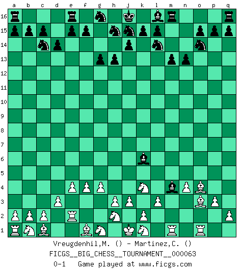 Last move : 0-1 2010 June 6 9:10:34 [Event "FICGS__BIG_CHESS__TOURNAMENT__000063"] [Site "FICGS"] [Date "2010.04.10"] [Round "1"] [White "Vreugdenhil,Maarten"] [Black "Martinez,Chapo"] [Result "0-1"] [WhiteElo ""] [BlackElo ""] 1.p1-o3 p16-o14 2.g2-g4 g15-g13 3.f2-f4 b16-c14 4.j2-k4 h16-a9 5.d2-d3 n15-n13 6.e2-e4 h14-h13 7.n2-n4 o16-g9 8.h1-l4 k16-l14 9.l4-f9 a9-f9 10.o1-f9 g9-o2 11.m2-m4 f16-n9 12.e1-e2 n9-m8 13.p2-p3 d15-d14 14.l1-o4 c16-p4 15.f9-n2 p4-o3 16.n2-o3 m8-k6 17.l2-l3 m15-m13 18.q1-o1 o2-m4 0-1 This big chess game has been lost on time (started : 2010.04.10 21:32:45) Follow this game move after move (download)Chess is a terrific way for kids to build self image and self esteem. (Saudin Robovic) Spielt Blackmar-Diemer-Gambit, und das Matt kommt von selbst! (Emil Joseph Diemer) No solamente yo pronostico su triunfo sobre Botvinnik, sino que me adelanto y digo que probablemente Fischer es el jugador de Ajedrez mas grande que haya existido. (John Collins) Le plus grand jeu de l'esprit jamais inventé, plus vous l'apprenez, plus vous y prenez du plaisir. (Garry Kasparov) Wisdom doesn't necessarily come with age. Sometimes age just shows up all by itself. (Tom Watson)