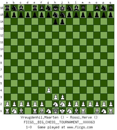 Last move : 1-0 2010 May 14 20:0:9 [Event "FICGS__BIG_CHESS__TOURNAMENT__000063"] [Site "FICGS"] [Date "2010.04.10"] [Round "1"] [White "Vreugdenhil,Maarten"] [Black "Rossi,Herve"] [Result "1-0"] [WhiteElo ""] [BlackElo ""] 1.g2-g4 1-0 This big chess game has been lost on time (started : 2010.04.10 21:32:45) Follow this game move after move (download)A Chess game is divided into three stages: the first, when you hope you have the advantage, the second when you believe you have an advantage, and the third... when you know you're going to lose ! (Savielly Tartakower) Mit Schach schule ich mein Gefühl für Geometrie, was für Tennis und Schach gleichermaßen wichtig ist. (Boris Becker) Los libros de Ajedrez deben de usarse igual como usamos los anteojos: para mejorar la vista, aunque algunos jugadores los quieren usar como si ellos les otorgaran la vision. (José Raúl Capablanca) Pour se monter efficace, un Cavalier a besoin d'avant-postes ! Les Cavaliers font les meilleurs bloqueurs de pions passés. I've lost money so fast in these clubs it's left me reeling. I've read every poker book ever written, but the only way to get better at the game is to go out and play with people who are really good. The problem is, you stand to lose a lot of money doing it. (Matt Damon)