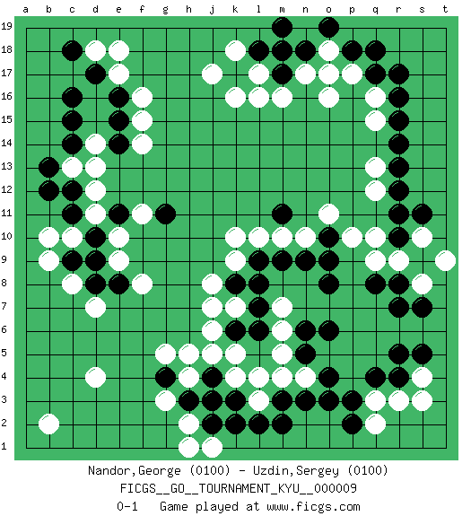 Last move : 0-1 2006 November 26 22:26:1 [Event "FICGS__GO__TOURNAMENT_KYU__000009"] [Site "FICGS"] [Date "2006.10.29"] [Round "1"] [Black "Nandor,George"] [White "Uzdin,Sergey"] [Result "0-1"] [Rating 1 "0100"] [Rating 2 "0100"] 1.q17 d4 2.c16 e17 3.q4 d14 4.c14 q10 5.r14 o16 6.r7 k4 7.c11 c8 8.e11 k16 9.n3 n4 10.o3 m4 11.o6 k10 12.r12 q16 13.r16 p17 14.r17 q15 15.r15 q13 16.o8 m7 17.g4 g5 18.j4 h4 19.h3 h5 20.k3 g3 21.m3 l3 22.l2 l4 23.j3 j5 24.d17 d18 25.c18 e18 26.e16 f15 27.g11 d12 28.c12 c13 29.b13 d13 30.c15 d11 31.e15 c10 32.d10 e10 33.d9 f11 34.c9 b10 35.b12 b9 36.m17 m18 37.k17 l17 38.l18 l16 39.n18 n17 40.m19 m16 41.p18 k18 42.m18 j17 43.o10 o11 44.m11 n10 45.n9 p10 46.o9 m10 47.m9 l10 48.r10 r9 49.r13 q12 50.s9 s10 51.r11 s8 52.s7 e9 53.l9 k9 54.l8 k7 55.l7 m6 56.k8 j8 57.o4 h2 58.j2 h1 59.k2 j1 60.m2 f16 61.e14 f14 62.d8 d7 63.q8 q9 64.r8 t9 65.s11 b2 66.k6 j7 67.l6 k5 68.n5 m5 69.n6 r3 70.r4 q3 71.p2 s4 72.s5 s3 73.r5 q2 74.p3 o18 75.o19 o17 76.q18 j6 77.e8 f8 0-1 Here are the names of the openings (joseki) played in the four corners : Corner d16 : c16 e17 Komoku (Somok, Xiao~mu`) 3-4 Point. The komoku (3-4) point is the traditional corner enclosure move.. Ikken Kakari (Hankan Keolch'im, Yi Gua`jiao~, 1-Space Low Pincer). The small knight move is the basic approach move to the 3-4 point stone. It has been continually used for over four centuries. There are limitless variations, with new moves constantly being discovered. White 2 opens the door to a treaure store of joseki. Player White won this Go (weiqi, baduk) game. Follow this game move after move (download)Territory really exists only in the end. (Pierre Audouard) The greatest con, that he ever pulled... was making you believe... that he is you. (Revolver, movie)