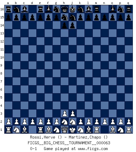 Last move : 0-1 2010 May 13 19:51:18 [Event "FICGS__BIG_CHESS__TOURNAMENT__000063"] [Site "FICGS"] [Date "2010.04.10"] [Round "1"] [White "Rossi,Herve"] [Black "Martinez,Chapo"] [Result "0-1"] [WhiteElo ""] [BlackElo ""] 0-1 This big chess game has been lost on time (started : 2010.04.10 21:32:45) Follow this game move after move (download)Chess problems demand from the composer the same virtues that characterize all worthwhile art: originality, invention, conciseness, harmony, complexity, and splendid insincerity. (Vladimir Nabokov) Fallen sollten polizeilich verboten werden. (Savielly Grigorievitsch Tartakower) Los finales de Peón son del Ajedrez lo que el cesped es del Golf. (Cecil Purdy) Votre seul travail dans les ouvertures est d'obtenir un milieu de partie jouable. (Lajos Portish) It's not a bug - it's an undocumented feature. (Anonymous)