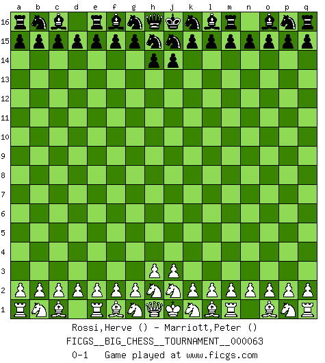 Last move : 0-1 2010 May 13 19:51:18 [Event "FICGS__BIG_CHESS__TOURNAMENT__000063"] [Site "FICGS"] [Date "2010.04.10"] [Round "1"] [White "Rossi,Herve"] [Black "Marriott,Peter"] [Result "0-1"] [WhiteElo ""] [BlackElo ""] 0-1 This big chess game has been lost on time (started : 2010.04.10 21:32:45) Follow this game move after move (download)Chess is everything: art, science and sport. (Anatoly Karpov) Die Leute spielen gegen mich seit 15 Jahren unter Ihren Möglichkeiten. (Robert James Fischer) Si no le temes a Spassky, entonces elimino el elemento del dinero. (Jim Slater) Les échecs, c'est l'art d'analyser. (Mikhail Botvinnik) The difference between stupidity and genius is that genius has its limits. (Murphy)
