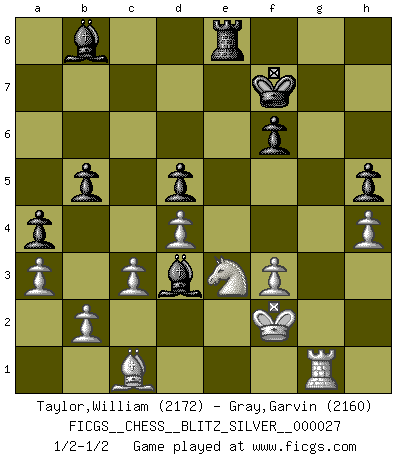 Last move : 1/2-1/2 2010 April 11 15:48:8 [Event "FICGS__CHESS__BLITZ_SILVER__000027"] [Site "FICGS"] [Date "2010.04.11"] [Round "1"] [White "Taylor,William"] [Black "Gray,Garvin"] [Result "1/2-1/2"] [WhiteElo "2172"] [BlackElo "2160"] 1.e4 e5 2.Nf3 Nc6 3.Bb5 a6 4.Ba4 Nf6 5.O-O Be7 6.Re1 b5 7.Bb3 O-O 8.c3 d5 9.exd5 Nxd5 10.Nxe5 Nxe5 11.Rxe5 c6 12.d4 Bd6 13.Re1 Qh4 14.g3 Qh3 15.Re4 g5 16.Qf1 Qxf1+ 17.Kxf1 Bf5 18.Nd2 h6 19.Re1 Rae8 20.Nf3 Rxe1+ 21.Nxe1 Re8 22.f3 a5 23.Kf2 a4 24.Bxd5 cxd5 25.Bd2 f6 26.Ng2 h5 27.Rh1 Kf7 28.h4 Bd3 29.Ne3 Kg6 30.a3 Bb8 31.Rg1 gxh4 32.gxh4 Kf7 33.Bc1 1/2-1/2 Ruy Lopez : Closed, 7...O-O Kingside Castling by player White (move 5) Kingside Castling by player Black (move 7) This chess game ended in a draw. Follow this game move after move (download)Chess is as much a mystery as women. (Purdy) Kein Großmeister ist normal. Sie unterscheiden sich nur im Ausmaß Ihrer Verrücktheit. (Viktor Kortschnoi) Un sacrificio se refuta mucho mejor al aceptarlo. (Wilhelm Steinitz) Les échecs sont un jeu par leur forme, un art par leur essence et une science par sa difficulté d'acquisition. Ils peuvent vous procurer autant de plaisir qu'un bon livre ou une belle musique, mais vous n'aurez une réelle joie que si vous arrivez à bien jouer. (Tigran Petrosian) Yoga is 99% practice and 1% knowledge. (Sri Krishna Pattabhi Jois)