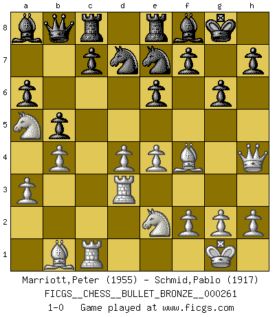 Last move : 1-0 2010 April 12 22:1:45 [Event "FICGS__CHESS__BULLET_BRONZE__000261"] [Site "FICGS"] [Date "2010.04.12"] [Round "1"] [White "Marriott,Peter"] [Black "Schmid,Pablo"] [Result "1-0"] [WhiteElo "1955"] [BlackElo "1917"] 1.Nf3 Nc6 2.d4 d5 3.c4 e6 4.Nc3 Nf6 5.e3 g6 6.Bd3 Bg7 7.O-O O-O 8.a3 Qd6 9.b4 a6 10.Bb2 dxc4 11.Bxc4 b5 12.Bd3 Bb7 13.Nd2 Ne7 14.Rc1 Qb6 15.Qc2 Rfd8 16.Nb3 Qc6 17.e4 Rac8 18.Rfd1 Ba8 19.Qd2 Qb6 20.Nc5 Nd7 21.Ne2 Qa7 22.Nb3 Qb6 23.Qg5 Bf6 24.Qh6 Bg7 25.Qh4 Bf6 26.Qh3 Bg7 27.Qe3 Nc6 28.Qg5 Bf6 29.Qd2 Ne7 30.Nc5 Qa7 31.Qf4 Bg7 32.Nb3 Nc6 33.Qg5 Bf6 34.Qd2 Nb6 35.Qf4 Nd7 36.Qf3 Qb6 37.Bc3 Bg7 38.Bc2 Ne7 39.Qh3 Qc6 40.Bd2 Qc4 41.Re1 Qc6 42.Bg5 Re8 43.Red1 Rcd8 44.Bb1 Qb7 45.Na5 Qa7 46.Qh4 Qb6 47.Rd2 Bf8 48.Be3 Qb8 49.Bf4 Rc8 50.Rd3 1-0 Reti Opening Kingside Castling by player White (move 7) Kingside Castling by player Black (move 7) Player White won this chess game. Follow this game move after move (download)I'd rather have a Pawn than a finger. (Reuben Fine) Es war undenkbar für die Behörden, dass ein sowjetischer Großmeister auf diese Art und Weise [Fischer-Taimanov 6:0] verliert, ohne dass es eine politischer Erklärung dafür gäbe. (Mark Taimanov) Me gusta decir que Bobby Fischer fue el mejor jugador que jamás haya existido. Pero lo que hizo de Fischer un genio, fue su habilidad de mezclar una frescura y pragmatismo Americano con ideas Rusas acerca de la estrategia. (Bruce Pandolfini) Je menace de comprendre la position. (Anonyme) Over-the-board chess is the favorite of mortals, correspondence chess is the favorite of the gods. (Eduard Dyckhoff)