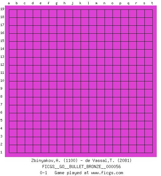 Last move : 0-1 2010 April 13 6:0:22 [Event "FICGS__GO__BULLET_BRONZE__000056"] [Site "FICGS"] [Date "2010.04.12"] [Round "1"] [Black "Zbinyakov,Alexey"] [White "de Vassal,Thibault"] [Result "0-1"] [Rating 1 "1100"] [Rating 2 "2081"] 0-1 This go game has been lost on time (started : 2010.04.12 23:5:2) Here are the names of the openings (joseki) played in the four corners : Player White won this Go (weiqi, baduk) game. Follow this game move after move (download)Ikken tobi is never wrong. (Anonymous) The hypothalamus is one of the most important parts of the brain, involved in many kinds of motivation, among other functions. The hypothalamus controls the 'Four Fs: Fighting, Fleeing, Feeding and Mating. (Unknown author)