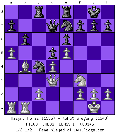 Last move : 1/2-1/2 2010 November 3 5:27:43 [Event "FICGS__CHESS__CLASS_D__000146"] [Site "FICGS"] [Date "2010.04.13"] [Round "1"] [White "Hasyn,Thomas"] [Black "Kohut,Gregory"] [Result "1/2-1/2"] [WhiteElo "1596"] [BlackElo "1543"] 1.e4 e6 2.d4 d5 3.Nc3 Bb4 4.e5 c5 5.a3 Bxc3+ 6.bxc3 Ne7 7.Nf3 Nbc6 8.Be2 Qa5 9.Qd2 b6 10.O-O Ba6 11.Bd3 cxd4 12.Bxa6 Qxa6 13.cxd4 O-O 14.a4 Rac8 15.Ba3 Rfe8 16.Rfc1 Na5 17.Bb4 Nc4 18.Qd3 Qb7 19.Rcb1 Qd7 20.a5 1/2-1/2 French : Winawer, Advance, positional Main line Kingside Castling by player White (move 10) Kingside Castling by player Black (move 13) This chess game ended in a draw. Follow this game move after move (download)Chess is ruthless: you've got to be prepared to kill people. (Nigel Short) Wer der Ansicht ist, daß alle Schachspieler verrückt sind, wird durch Studium des Lebens von Emil Josef Diemer nicht auf andere Gedanken kommen. (Hans Ree) Un buen sacrificio es aquel que aunque no sea necesariamente sólido, deja a tu oponente aturdido y confuso. (Rudolph Spielmann) Echiquier : carré parfait, comme la Jérusalem nouvelle décrite par l'auteur de l'Apocalypse, huit cases sur huit, exaltation du chiffre 4, symbole du cosmos aux quatre horizons... où le noir et le blanc, l'ombre et la lumière, le mal et le bien s'entremêlent et se conjuguent. (Robert Couffignal, Le Gambit du poète) Question: Is 'This statement is paradoxical' a paradoxical statement ? Or is it a meta-paradox ? (Normajean Yates)